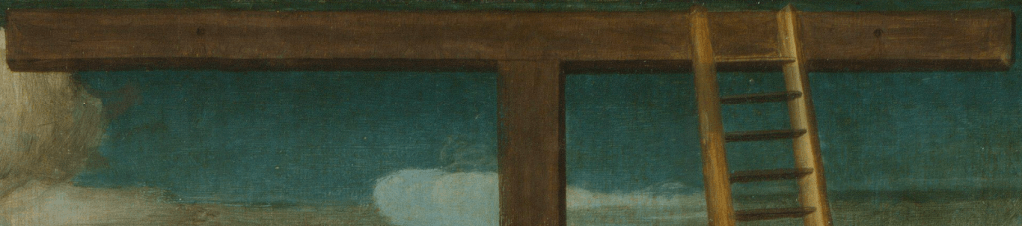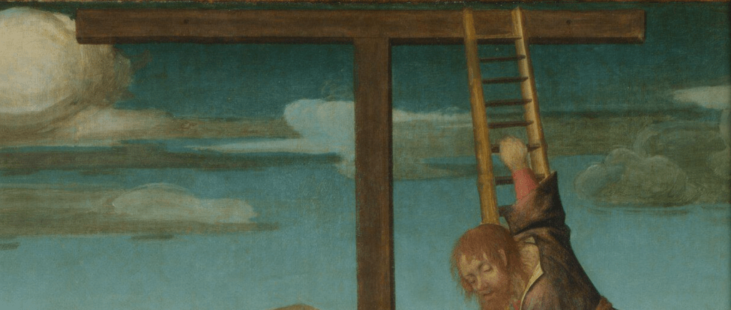 There is something particularly bleak about today’s detail, I feel. It is empty, devoid of life, despite the person clinging to the ladder, whose aim, anyway, appears to be downward, to get out of view. The tau cross is revealed in all its simplicity, and even the titulus has been taken away. Only the holes for the nails – prepared by the auger we saw in Lent 9 – remain. The sky itself seems silent. A ladder is perched against one arm of the cross, and a bearded man descends, hanging on with his right hand, looking down.