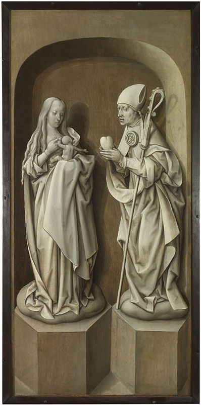 So what do we see here? There are four figures, conceived as stone sculptures, standing on irregular hexagonal plinths, casting shadows onto the backs of the niches in which they stand. The right side of each niche is more brightly lit than the left, which suggests that the main light in the chapel where this painting was originally located came from a window on the worshipper’s left. The ‘sculptures’ represent the Virgin and Child and St Augustine of Hippo on the left wing, and on the right are Sts Peter and Mary Magdalene. St Augustine can be identified because he is a bishop: he wears a mitre – the hat with two points – and carries a crozier, an episcopal equivalent of a shepherd’s crook, which indicates the care of his flock – all of the Christian souls in his diocese. He also wears a cope – the ceremonial cloak, or cape – which is fastened with an elaborate clasp, called a morse. But there have been many holy bishops. It is the heart that tells us this is St Augustine. It relates to a quotation from the the Book of Proverbs (23:26) in the Old Testament: