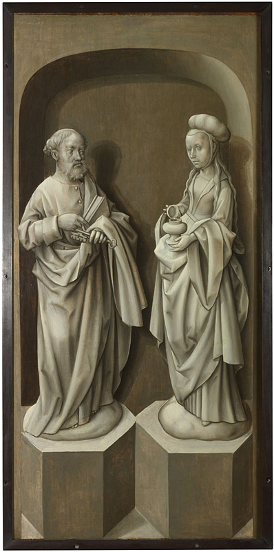 This is the same painting – although you would be forgiven for not recognising it. The work is a triptych – a painting on three panels – and for most of the time it would have been closed, only to be opened when mass was celebrated at the altar on which it was originally found. The ability to close altarpieces like this served several purposes, and one was purely practical: to keep dust off the richly coloured surface. The exterior panels were almost always far less colourful, and here, as so often, they are painted in grisaille – from gris, or ‘grey’, in French – a term for monochrome painting, which is usually intended to look like sculpture. As such, the exteriors of triptychs are not attention grabbing. When opened, the far richer colours would then draw people to the altar where mass was being celebrated, and conversely, when closed, the colour would be removed – ideal for a season so focussed on withdrawal and contemplation as Lent. This, of course, creates ambivalence. The richly coloured surface we have been contemplating throughout Lent should not have been visible. But by the time it could be opened – on Easter Sunday – then everything that has gone before is all but irrelevant, perhaps, as that is the day to celebrate the joy of the resurrection.