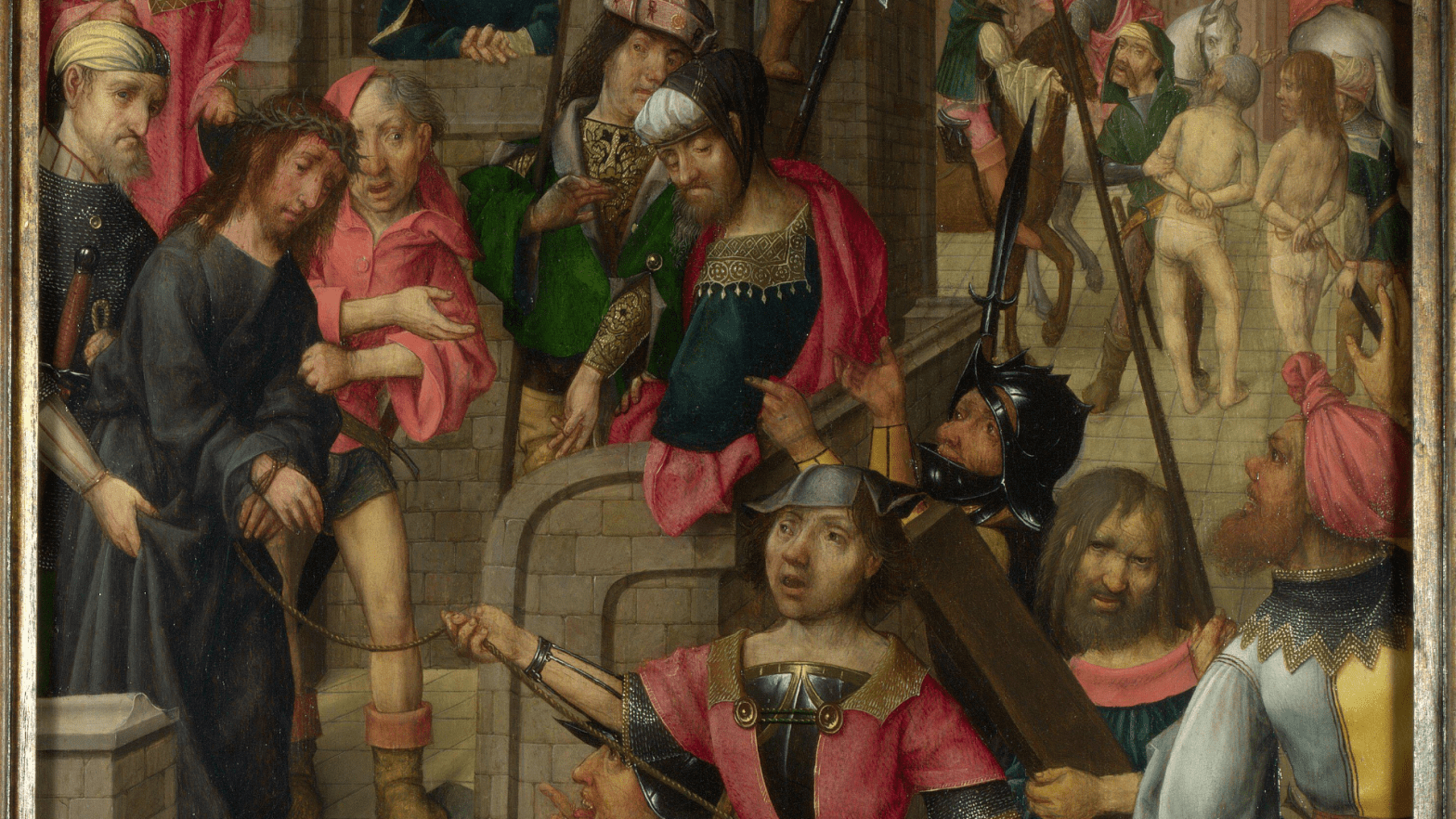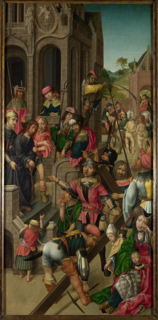 ‘Behold the man!‘ – or Ecce Homo – is the name given to images like this. However, the narrative has gone a little further, as he no longer wears the purple robe. An ensuing discussion – with the mob heavily influenced by the chief priests – determines that Jesus will be crucified. And Pilate, against his will, submits to this. Although other gospels tell us that the purple robe was removed, and replaced with ‘his own clothes’, John omits this detail. Nevertheless, the precise moment that is painted by the Master of Delft is, I believe, that in John 19:16-17, who tells us what Pilate did next: