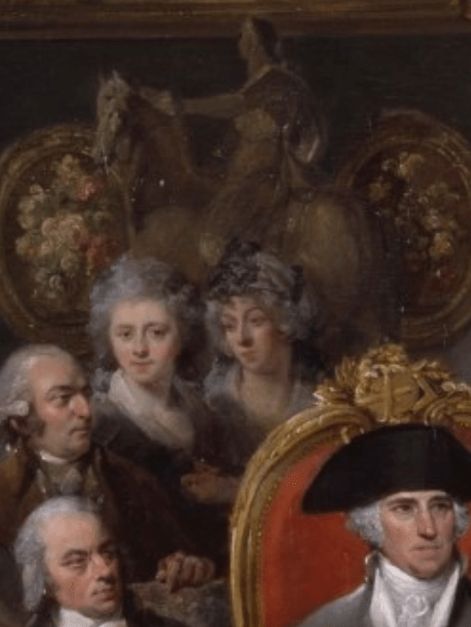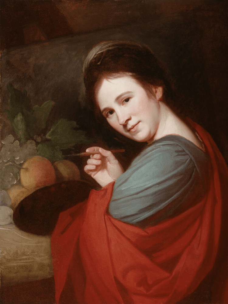 When you look at the painting as a whole it would be very easy to dismiss the appearance of these two women as ‘marginalised’ – they are, after all, pushed to the back of the gathering. However, they shouldn’t be there at all: Kauffman and Moser were not allowed to attend the General Assembly. So, despite this inexplicable bar, their inclusion in the painting is a sign of the great esteem in which they were held. They may be at the back, but they are more-or-less central, and just over the shoulder of the second President of the Royal Academy, Benjamin West, enthroned on his gold and red-upholstered chair. The women are perfectly placed to be seen. Not only that, but some of their paintings are also depicted – unlike the works of many of the Academicians who are present. We have seen the two by Moser hanging on the wall behind them: there are also two by Kauffman, Design and Composition, set into the coffering of the ceiling. If you want to know more about one of these – and another equivalent painting, Colour, then look back to Day 48 – Colour and Design. The fact is, the women are there, in the painting, their status acknowledged and their work on view: people could see them and know who they were. Next week we will look at a painting in which the situation is really rather different.