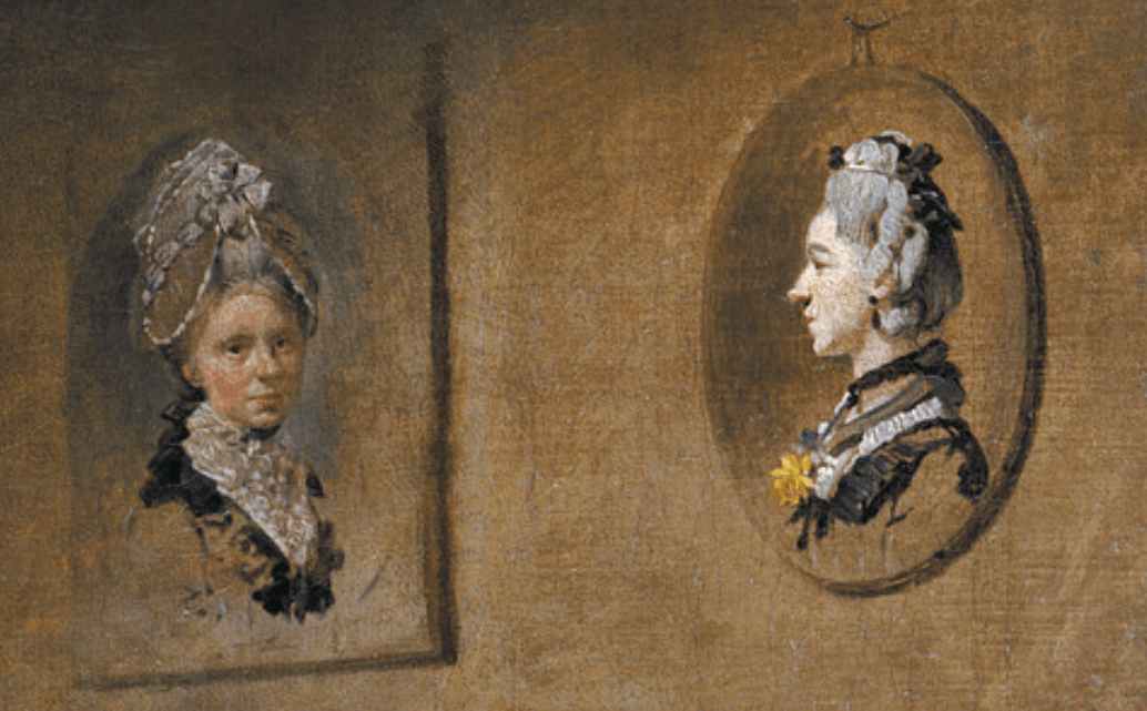 Two weeks ago I talked about Mary Moser, one of the two women who, in 1768, were founder members of the Royal Academy. Today I would like to talk about a portrait of her, which hangs next to another, which depicts her fellow founder Angelica Kauffman (who will be the last of my Three Women in the 18th Century this Monday (10 May) at 2pm and 6pm). They are not ‘real’ portraits, but details from a larger painting by Johann Zoffany, which is the nominal subject of this post. Angelica Kauffman is on the left – the rectangular canvas – with Mary Moser on the right, in an oval. The two still life paintings I discussed before (126 – Mary Moser) were also oval: I wonder if that is why the same format is used here? She was, as you may remember, famed for her flower paintings, which certainly explains why she has a large, yellow bloom attached to her bodice in Zoffany’s imagined portrait. In both, the bust-length image appears against a plain background. It might have become more elaborate: neither portrait has been completed. Today we are dealing with unfinished business.