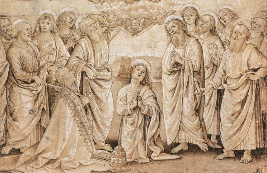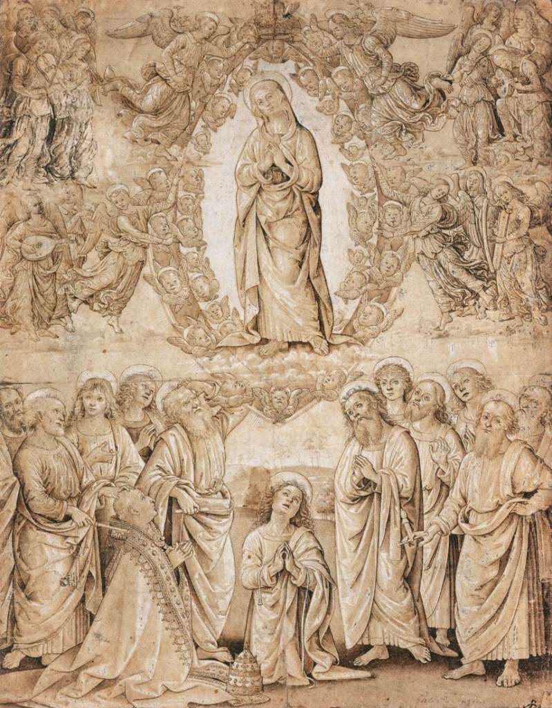 At the bottom of the drawing we see Sixtus IV kneeling with his triple tiara sitting on the ground, much as it does in Raphael’s painting. He is confirmed as St Peter’s successor by the man himself, who places his left hand on his head, and taps him on the shoulder with one of the keys to the Kingdom of Heaven, almost as if knighting him from behind. At the bottom of the mandorla – or almond-shaped glory – surrounding the Virgin Mary are three winged cherubim heads, looking up in much the same way that Raphael’s two angels do. St Paul stands on the right, resting one hand on his sword, and looking out towards us. It is all but impossible that Raphael did not know the original painting.