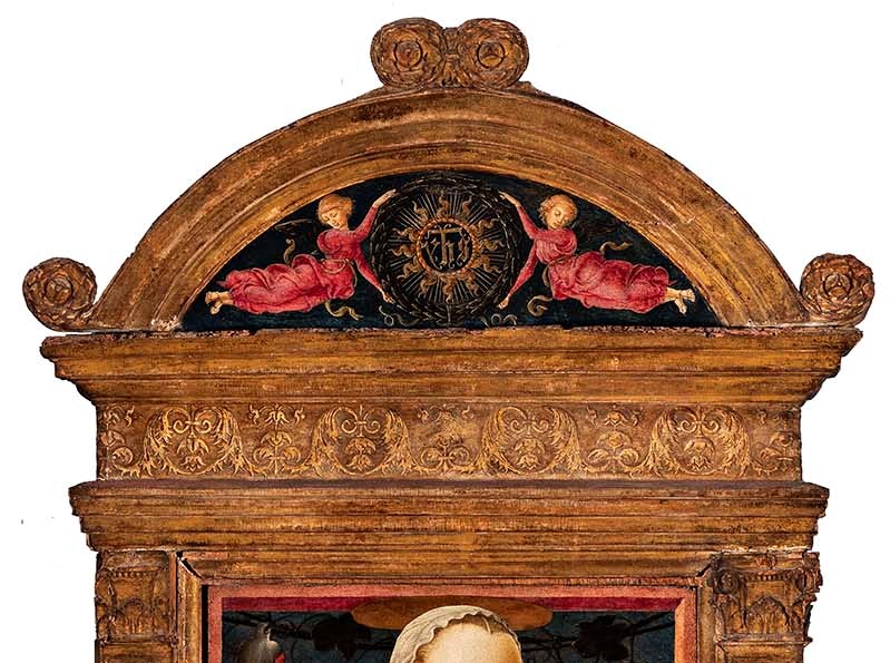 There might be some clue as to the original patron, and/or intended location, from the section of the painting at the top. The frame is a piece of miniature architecture. Two pilasters, decorated with what are referred to as candelabra, are topped by classically inspired capitals, sitting somewhere between Ionic and Corinthian – but this is an early renaissance form, as the full ‘classical language’ of architecture had not yet been fully formulated by renaissance architects. Nevertheless, the two pilasters support a full entablature, made up of an architrave (the ‘beam’ at the bottom), a frieze (decorated with stylised leaves, some of which seem almost anthropomorphic) and a cornice – the three flat strips at the top. In its turn, the entablature supports a segmental pediment, with rosettes sitting to the left and right and at the summit. The pediment itself is also painted with two angels in red holding onto a sun-like symbol. This is the ‘Name of Jesus’, a monogram formulated by the ardent 15th Century Franciscan preacher St Bernardino of Siena. As seen here it looks like ‘yhs’ – with a line through the ‘h’ – but ‘ihs’ would be a more usual formation, being derived from the first three letters of ‘JESUS’ in Greek (ΙΗΣΟΥΣ). The line through the ‘h’ tells us that the monogram is an abbreviation, but also, conveniently, forms a cross with the vertical of the ‘h’. Taking the idea from the biblical text, ‘At the name of Jesus every knee shall bow’ (Philippians 2:10, cue communal hymn singing), Bernardino used this sign to unite warring factions, and to inspire devotion. It would therefore make sense if this painting had been commissioned for a Franciscan church – and there is indeed a San Francesco in Ferrara, and there was from as early as 1232. But then, there was also a church – and convent – dedicated to San Bernardino himself. It is not there anymore, though – it was destroyed in 1825. At one point (1509) the convent was acquired by none other than Lucrezia Borgia (who was, among other things, the second wife of Duke Alfonso I of Ferrara) as a gift for her niece, who eventually, in 1543, became the abbess – but that’s another story.