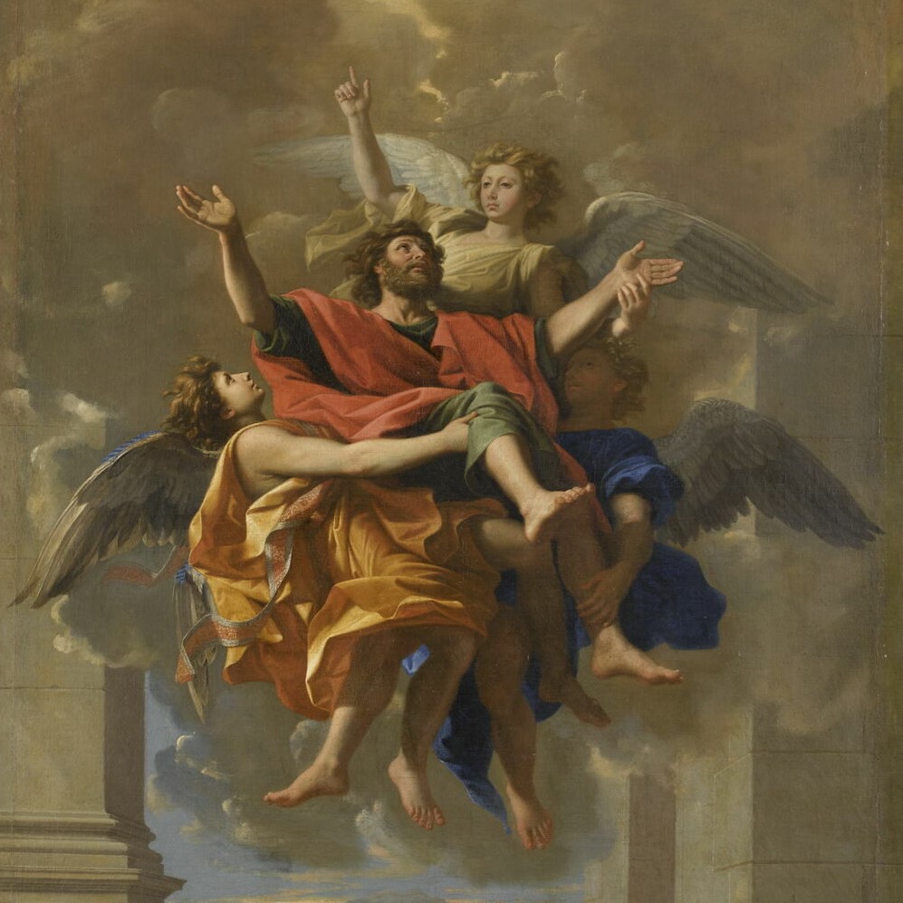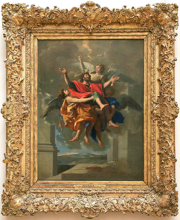 A few years after his arrival in Rome in 1624, Poussin was commissioned to paint the Martyrdom of St Erasmus for St Peter’s, but this was to remain one of only a handful of church commissions. So few were they – and so out of tune was he with the Roman Baroque – that the entry on the website of the Met in New York goes so far as to says, ‘The large, theatrical saints in ecstasy and scenes of apotheosis so popular at the time clearly struck no responsive chord in Poussin,’ and yet it is precisely this sort of work – today’s painting, and an Assumption of the Virgin in the National Gallery of Art in Washington – which have always been among my favourites. They are completely airborne, not the earthbound, weighty things that his works, at their most stolid, can be – works which, I’m sure it goes without saying, do not include his elegant depictions of dance! We see St Paul raised aloft by three angels, his usual attributes of book and sword left behind, with the remarkable combination of legs, arms and wings (eight, eight and six of these respectively, although not all are visible) acting as a form of mandorla (Italian for ‘almond’), the shape in which the spiritual glow of an assumption or ascension is usually depicted.