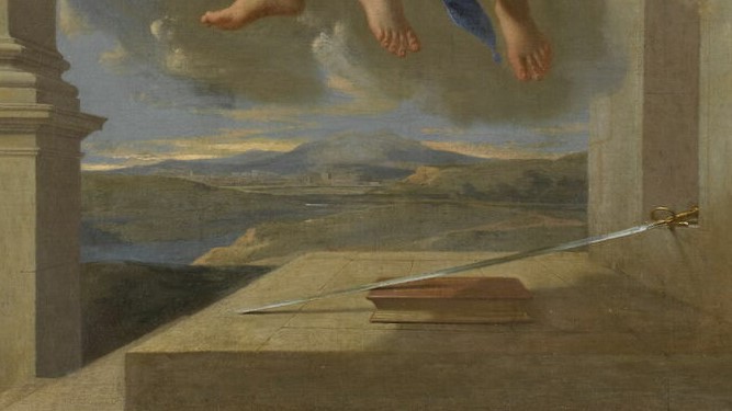 It was the second time Poussin had painted the subject. The first, dating from 1643, just a few years before, was for his friend – and patron – Paul Fréart de Chantelou. It was a direct response to a commission for a painting to hang with one of Chantelou’s prized possessions, Raphael’s equally astonishing Vision of Ezekiel. Poussin seems to have been worried that his painting would not stand up well to the comparison with the great renaissance master, and asked that the two paintings should never be shown together. He even went so far as to suggest that his work might serve as a cover for the Raphael, as a sort-of warm-up act, if you like. Today’s painting was the result of another commission, from writer Paul Scarron, who in 1643 had published A Collection of Some Burlesque Verses. Poussin hated Scarron’s work, and tried to put him off. However, the commission came via Chantelou, and so eventually the painter relented. At first Scarron was offered a bacchanalian subject, but, for whatever reason, this was not what he wanted, and the commission evolved into this inspirational image of the poet’s name saint, Paul. For his second essay on this theme Poussin developed a composition which came far closer to Raphael’s Ezekiel than the earlier version, perhaps because this time, there was no chance of a direct comparison.