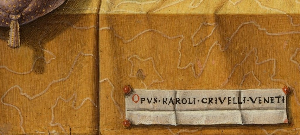 It is at the very bottom of this small painting – measuring just 37.8 x 25.4 cm – that it gets conceptually complex. There is no problem with the cloth – a yellow water silk equivalent to the pink of the cloth of honour. Having been stored tightly folded, one of those folds is clearly visible as the central axis of the material. But it is also softly wrinkled, the subtle shading forming a counterpoint with the markings of the fabric. The child’s legs and the tasselled cushion cast shadows, those of the latter being remarkably crisp. They tell us that the light is coming from high up to the left, and from just in front of the painting. At one end the parapet is cracked, and at the other there appears to be the most enormous fly. Both are symbols of change and decay, but Jesus has come for our redemption – to free us from the sin, which, in some way, the fly represents, associated as it is with death and disease, in part because of the brevity of its own earthly existence. The cracks can be read like the ruins in the background of many paintings of the Nativity: Jesus has come to rebuild, rather than to destroy. But let’s look at the fly again – and compare it to Christ’s feet. They are of the same order of size. Can you imagine a fly the same size as a baby’s feet? Look again at the fly, and then at its shadow, and compare the shadow to that cast by the tassel. The light on the fly appears to be coming from the wrong direction… which suggests that it is not standing on the parapet at all. It appears to be standing on the surface of the painting, and casting a shadow onto the paint. If I were there in front of it, I’d be tempted to brush it away. It is a fly from our world – hence its disproportionate size – and Crivelli is playing with our perception. If he is good enough as an artist, he will trick us into thinking it is real – like the old story of the competition between Zeuxis and Parrhasius. Zeuxis painted grapes which were so real that birds flew down to eat them, but when he went to pull back the curtain in front of Parrhasius’ painting, he discovered that it was a painting of a curtain… so which was the better artist? Crivelli adds these details to keep us involved, to make us believe what we see (‘if it can crack, it must be real stone’), but also to remind us that this is a painting. Why do we want to know that it is a painting? Probably because that itself implies that the subject is worthy – that Jesus and Mary are worthy – to be represented, and so should be honoured accordingly. And also, of course, to show us how good he is. But how do we know who ‘he’ is? Well, because he tells us.