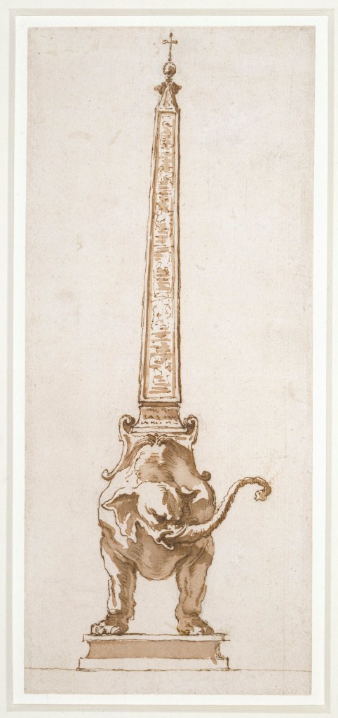 Apart from the Royal Collection drawing, others suggest that Bernini contemplated other means of holding the obelisk up – one features Old Father Time holding both a scythe and the obelisk, while in another it is Hercules who carries the weight. In the Piazza Navona, as you may well know, there is a different obelisk born aloft by the rocky structure of Bernini’s Four Rivers Fountain. It may be that the Pope was given a choice as to how he wanted the Egyptian treasure borne aloft – and if he was, he chose the elephant. But why?
