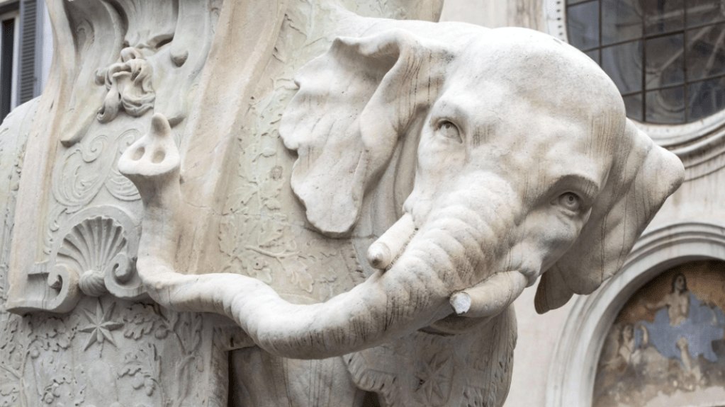 My main advice when looking at any sculpture – if it is freestanding – is to walk around it, and as you do so, to look for the most interesting points of view. Consider which are the better ways to look at it, and if there is a single ‘best’ viewpoint. For the elephant, the front – as discussed above – is definitely the best, but looking diagonally across the plinth we get the unavoidable feeling that the enormous beast is looking towards us. However, the carving of the eyes – making shadows which we read as pupils – suggests that the creature is looking over our heads. The trunk frames the right ear rather beautifully, and makes a nice counterpoint with the straight edge of the saddle. I’m sure that Bernini was interested in this point of view as well – although I’m not really sure what relevance it has. Sadly, this photograph shows us the damage which the poor pachyderm suffered back in 2016 – an unidentified vandal struck off the tip of its left tusk, although the severed section was abandoned nearby, and has now been skilfully reattached.