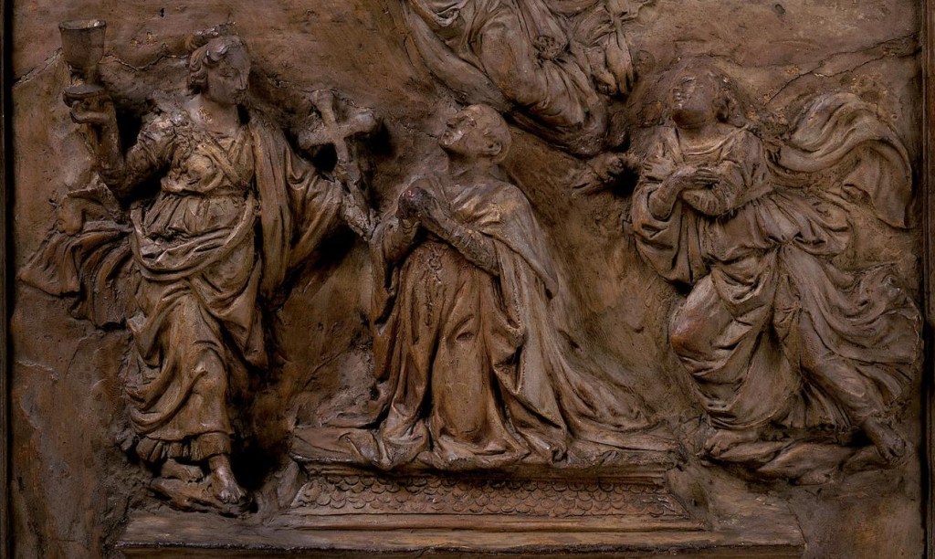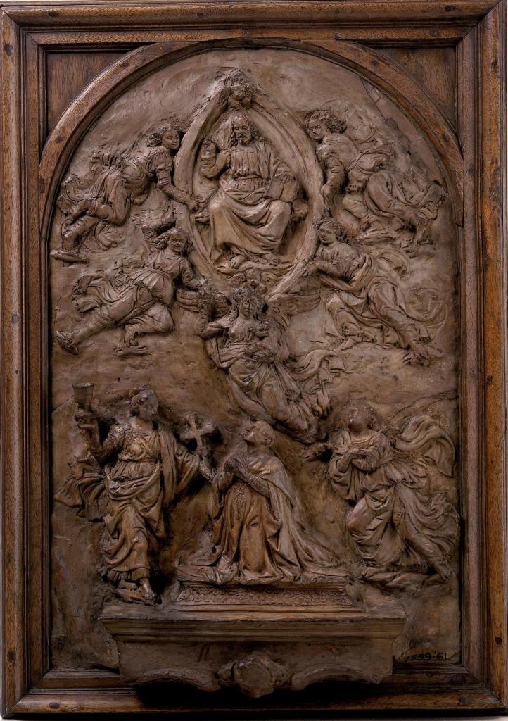 We are very familiar with the idea of a sketch as a drawing, but anything that is done quickly, or remains apparently unfinished, can be considered a sketch. It could be an oil painting (remind me to show you one of my favourites!) or, as here, a sculpture. They are sometimes also called modelli – or models – as this is what they are – a small version of something which, when finished, will be far larger. Given the vicissitudes through which all art has past, the survival of a clay model from the 15th century is quite remarkable. Admittedly, it has not come down to us unharmed – there are a few repairs visible at the bottom of the relief (the man’s praying hands are made from red clay, for example) – but it is still in a wonderful condition.