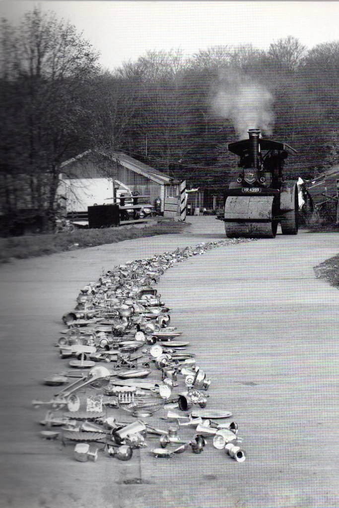 The wires must change. If hung in a different room, the ceiling will have a different height, and, if the pieces must be a set distance from the floor, then the wire has to be different. It’s copper wire, and I suspect that is to create a specific feeling, slightly warmer than all-over silver, maybe a hint of sunlight shining down. Although maybe it is because the objects themselves are not solid silver, but silver plate – a very thin layer of silver over another, cheaper metal, usually brass, which is itself an alloy of copper and zinc. Eventually, with polishing, Parker says, the brass will show through. None of the objects were new: as she says in an extended interview with the Tate’s curator, Andrea Schlieker, in the catalogue for the current exhibition, the work ‘is made of objects from ordinary people’s lives. None of it is new’. This gives it a history – gives every pieces a history – an unwritten catalogue of many people’s day-to-day existence. The stories they could tell. But why have they been flattened? And how? It’s quite simple really (this is the ‘more to it than meets the eye’ which I mentioned above).