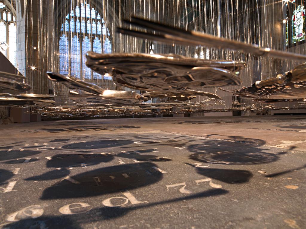 Getting closer, you can see that each pool is made up of a number of domestic objects. In this detail there are six spoons top left, and fives forks to the right of top centre, for example. But there are also jugs, teapots and tankards, salt cellars and candlesticks, and what must have been some form of trophy. But these objects are not as they were, they have suffered considerable damage, subjected in some way to violence: they have been flattened. And they are hung from thin wires – the slight kinks tell you these are not cotton threads (for example). Lit from above, they cast shadows on the floor.