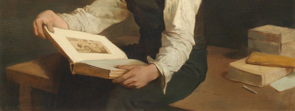 Rice sits on a plain wooden table with a large book held open on his lap between the thumb and forefinger of each hand. Visible on the right hand page – the one which has more visual prominence when leafing through – is a monochrome image, presumably a black and white engraving. But then the painting as a whole is more-or-less monochrome, moving through a palette of ivory, creams and browns to black, with nothing quite as bright as high white, or even as dark as the deepest black. It is the palette you would associate with the late works of Leonardo, Rembrandt or Caravaggio, although the clarity of depiction is closer to the earlier, but mature phase, of the third of these. The sitter looks over his left shoulder, creating a strong twist through the body, given that his legs are angled to our left, and his head to our right. He doesn’t appear to be looking at anything, though, but remains deep in thought, maybe contemplating what he had been looking at in the book, or planning something, or maybe even musing on the past – we are not told: this, I think, is part of the allure of the work for me.