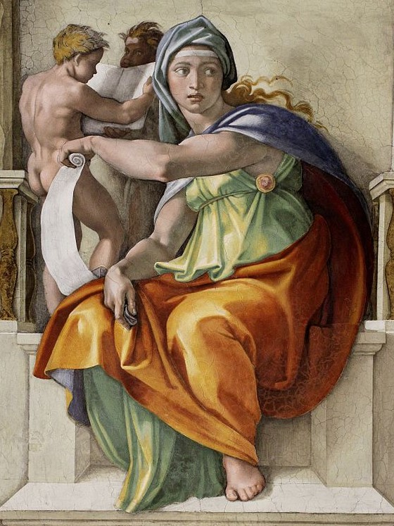 Overall it is remarkably similar to the Delphic Sibyl, who also has her knees to our left, whilst looking over her left shoulder to our right. The arms are in a different position, perhaps, but if you were to lift her right arm and lower the left, they wouldn’t be far off.