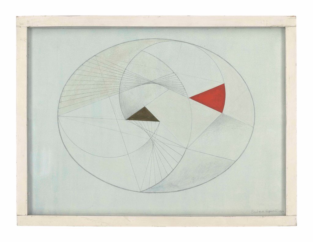 There are several versions and variants of this piece, all of which seem to have more or less the same date. It is called ‘linear’ construction, because of the straight lines made by the nylon filament. Seen together, these become tangents to a virtual curved line. In the 1930s Hepworth and Nicholson became active members of the European avant garde, and became particularly associated with the Constructivist movement. In 1937 the book Circle: International Survey of Constructivist Art was published in London. Its editors were none other than Naum Gabo and Ben Nicholson, together with architect Leslie Martin, while Hepworth designed the layout, as well as being responsible for the production of the book and writing one of the essays. At the time her sculptures had names like Three Forms (1935), Ball, Plane and Hole (1936) and Pierced Hemisphere (1937) – entirely abstract titles. On moving to Carbis Bay in 1939 things started to change. In part, this was the result of the war – materials were not readily available, and she was left with full responsibility for looking after her four children, leaving precious little time to work – and precious little material to work with. When she could grab a moment she would draw. Here, for example, is Oval Form No. 2, from 1942: