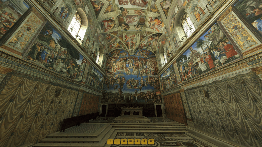 He is in the most prominent position, dead centre, above the altar, not far above Christ at the Last Judgement (which wasn’t there, of course, when he was painted – but more about that on Monday). Like his fellow prophets and sibyls he sits on the curving section of the vault, a transition between walls and ceiling. If we were to enter through the Ecclesiastical West Door (geographically it’s actually the other way round, but never mind), he would be one of the first things we saw. However, tourists enter through the door at the bottom right of the Last Judgement. Suspiciously this is directly underneath the depiction of the mouth of hell – are the directors of the Vatican Museums trying to tell us something? It is as if we, unlike the other damned, are escaping everlasting torment only to endure the purgatory that visits to the Sistine tend to be these days. And what are the little yellow squares at the bottom of this image? Well, it comes from my new favourite website, a high-resolution virtual model of the whole chapel hosted by the Vatican itself. Click on the link, and I’ll see you in a couple of months when you’ve finished looking round.