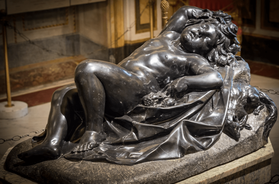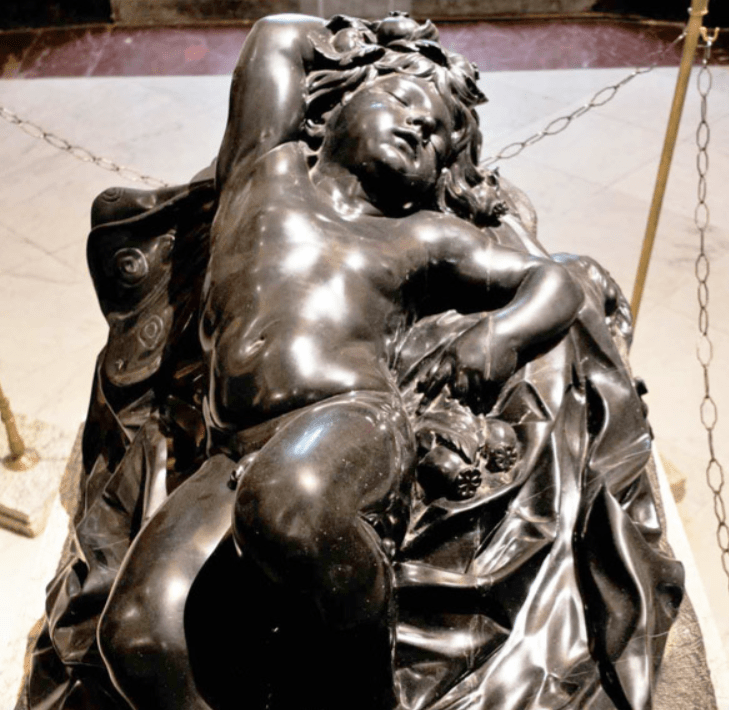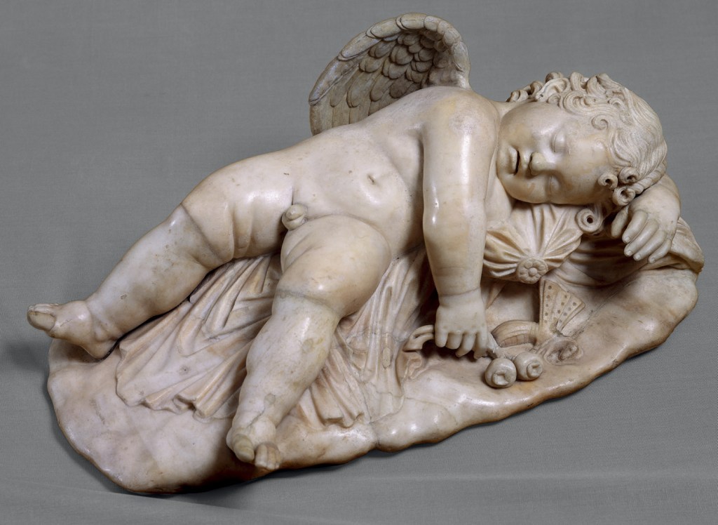 The sculpture was carved in what is called Belgian black marble, although it is not, truly speaking, marble (a metamorphic rock, transformed by high temperature and huge pressure), but a very fine-grained carboniferous limestone – a sedimentary rock. It was commissioned in 1635 by Marcantonio Borghese, nephew and heir of Cardinal Scipio Borghese who had built a phenomenal collection of ‘ancient’ and ‘modern’ art, and who had died just two years before. We don’t know why, exactly, Marcantonio wanted a personification of Sleep, but it was an image derived from antique prototypes which were popular not only in classical times but also in the 16th and 17th Centuries. Here is another embodiment of a similar idea, and another of my ‘secret pleasures’.