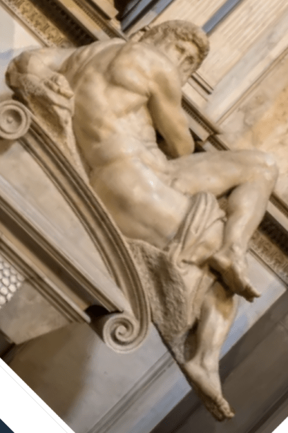 This ‘heightening’ Malvasia mentions is precisely the definition of forms using darker ink which I have discussed. As we can see from this detail, it is also used to created drama, through what we now see as a typically baroque chiaroscuro – the contrast of light and shade. The figure leaning against the rock on the left has details of both the drapery and anatomy heightened in this way, but he also casts a shadow onto the figure to the right, who is pulling on his hose (leggings), having just been baptised. The dark shadow initially makes this seated figure hard to read. The leaning figure is in quite a complex position, with one leg crossed over the other, the right hand behind his back, and the left resting on a stick in front of his chest. He also looks out towards us over his right shoulder – a position so convoluted in fact, that it seems that Sirani was clinging on to some mannerist tendencies from the 16th Century. Indeed, it has echoes of another figure, which I have up-ended to make my point.