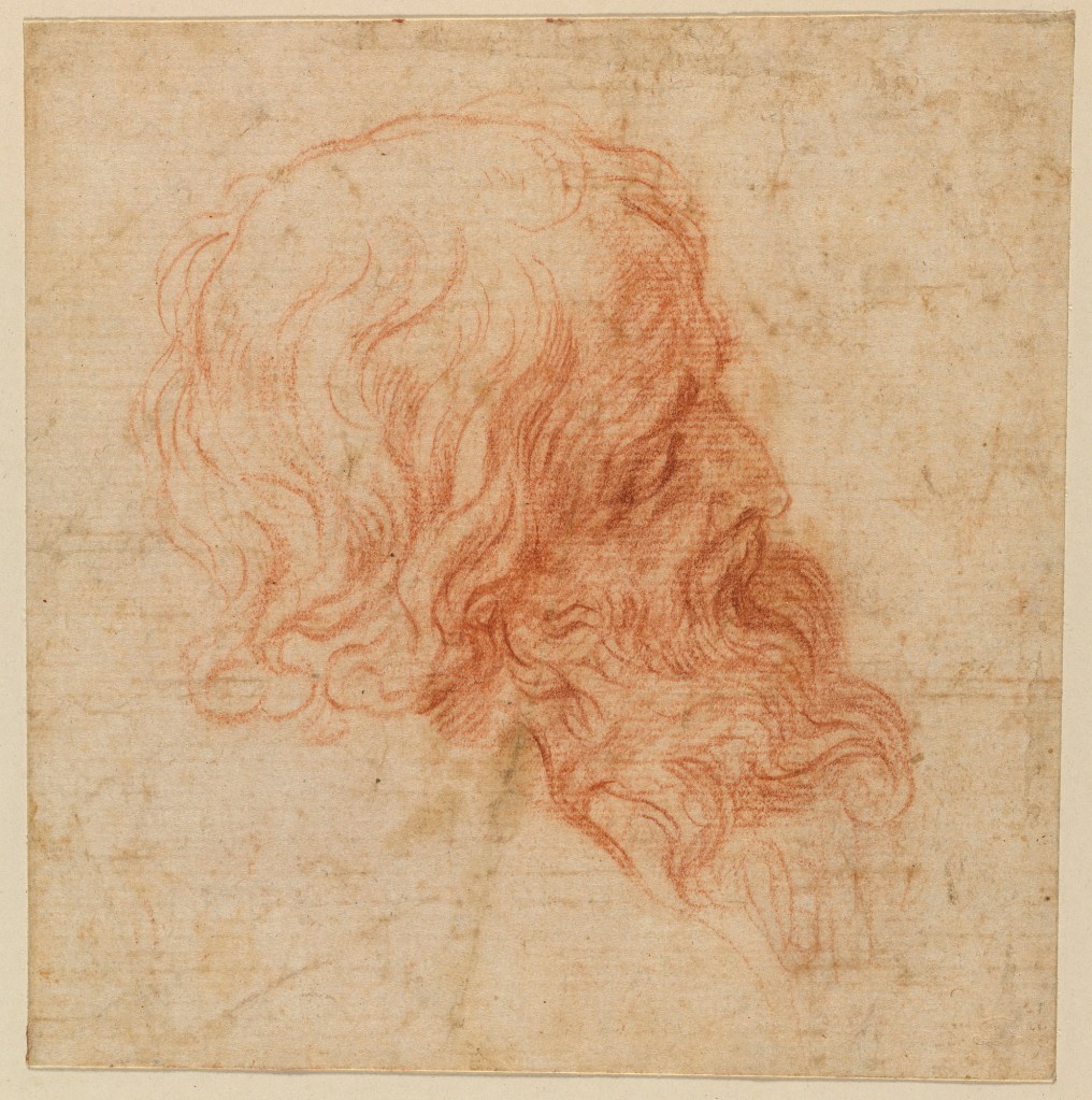 If we start by focussing on the essentials, we can see that Jesus is kneeling on a rock, and apparently not in the water itself. Without checking every other baptism I’ve seen, I can’t think of any others like it. Also unlike many other depictions of the story he is wearing some form of drapery. In most images he wears only a loin cloth, and in some early paintings, even less, and is visibly naked. Sirani clothes him in something like a toga, but with no tunic underneath. This may well be due to the fact that it was considered unsuitable for a woman to depict (let alone look at) naked men – and a man in a loin cloth was, to all extents and purposes, naked. This drapery also strengthens Jesus’s relationship to John the Baptist, who is similarly attired – although the quality of his drapery is different. This could be in line with the biblical description of him wearing camel skin, or it may simply be that Sirani is giving Jesus a higher status. Notice how she draws attention to him by using a darker shade of ink for the shadows, a strength of contrast which is only equalled in the Baptist’s head: we are made aware of John’s presence, but it is Jesus who stands out. The figures in the background look further away not only because they are smaller, and because we can see the ground between them and us, but also because the ink is paler, and the details are not heightened with darker lines. It is a form of atmospheric perspective. As I hope this will show, Sirani’s drawing technique was extremely accomplished. You may be able to make out some faint, wispy lines – between the Baptist’s legs, and in the drapery across Jesus’s right thigh, for example – which give a clue to the development of this image. The materials quoted are ‘pencil, ink, and brown wash over black chalk on paper’. The initial sketch would have been in black chalk (what remains of this are the wispy lines), and this sketch which would then have been refined with pencil (although not in the form we have today, with graphite embedded in wood: the modern pencil was invented by Conté in 1795). The brown wash would have followed, and after this came further definition from the darker ink.