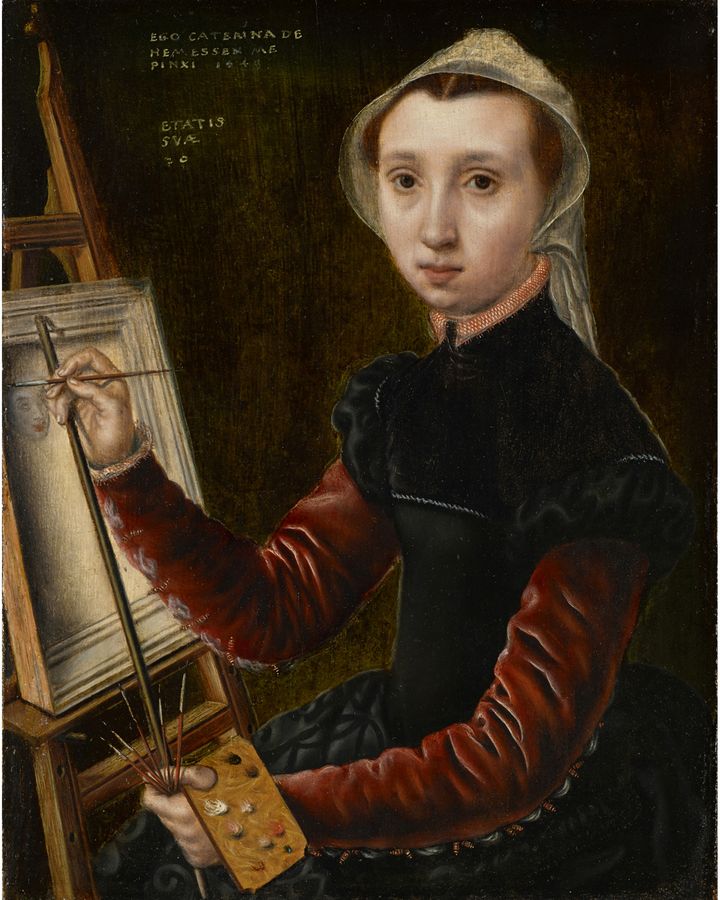 But women needed to let people know that they could do it – and what better way than by showing themselves in the act of painting. As a result there is a disproportionately large number of self portraits of artists painting which were executed by women. And Catharina was clearly proud of her work: a direct translation of the inscription on this example would be, ‘I, Caterina de Hemessen, painted myself, 1548’, and then, ‘Her age 20’.