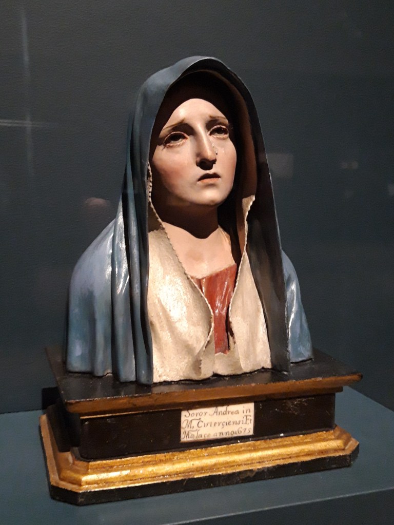 This is an incredibly delicate sculpture. According to the Hispanic Society of America’s ‘Collection Search’ it is 17cm high, and I am assuming that this refers to the bust, rather than including the base, although the entry is not specific. I’ll take a ruler the next time I go to the exhibition. The materials are listed as ‘Wood, polychrome’ – meaning, quite simply, that it is carved out of wood and then painted in different colours. The colours themselves are entirely traditional for the subject, and indeed, our identification of the subject is entirely based on the colours: a red dress, a white head-dress, and a blue cloak hung over the head – this must be the Virgin Mary, Mother of Jesus. She looks up, her chin slightly lifted, with her eyes shaded and partly closed. Her eyebrows slant down towards either side of her face, her lips are slightly parted and even more slightly downturned on either side. She is looking up, of course, at her son on the cross, her restrained grief plain for all to see, hence the title in Latin: Mater Dolorosa, ‘the grieving mother’. When the title is given in English – as it is for an equivalent sculpture at the Fitzwilliam Museum in Cambridge (see below) – that it is listed as ‘the Virgin of Sorrows’. Within this difference – ‘mother’ and ‘virgin’ – the entirety of Mary’s unique status is made clear.
