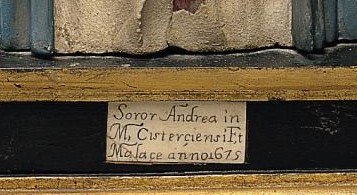 Remember that this is wood cut with a mallet and chisel. Both the blue cloak and white headdress – which has delicate stitching along the hem – are carved to a couple of millimetres of thickness (or thinness, rather): it would have been so easy to break through these membranes with one slip of the chisel. They are carved deeply around the head and neck to create the deep shadows which enhance the depth of Mary’s sorrow. Whereas the catalogue photograph (below) is lit evenly, as befits a catalogue, for clarity’s sake, in the exhibition the lighting is superb, and more dramatic: the shadows are deep and the tears glint in the light. You might argue – and you would be right – that Andrea de Mena did not have electric lighting to achieve these effects. However, the deep cutting of drapery was common, especially for Baroque sculptors who wanted to capture the drama of painterly chiaroscuro, which is best exemplified, of course, in the work of Caravaggio. And daylight coming through a window – or candlelight, or lamplight at night – would achieve similar results in any century. But how did Andrea de Mena, an artist of whom I had not previously heard, achieve such mastery? And, for that matter, how do we even know that she did? Well, for one thing, she signed it.