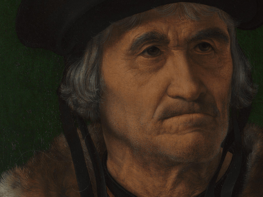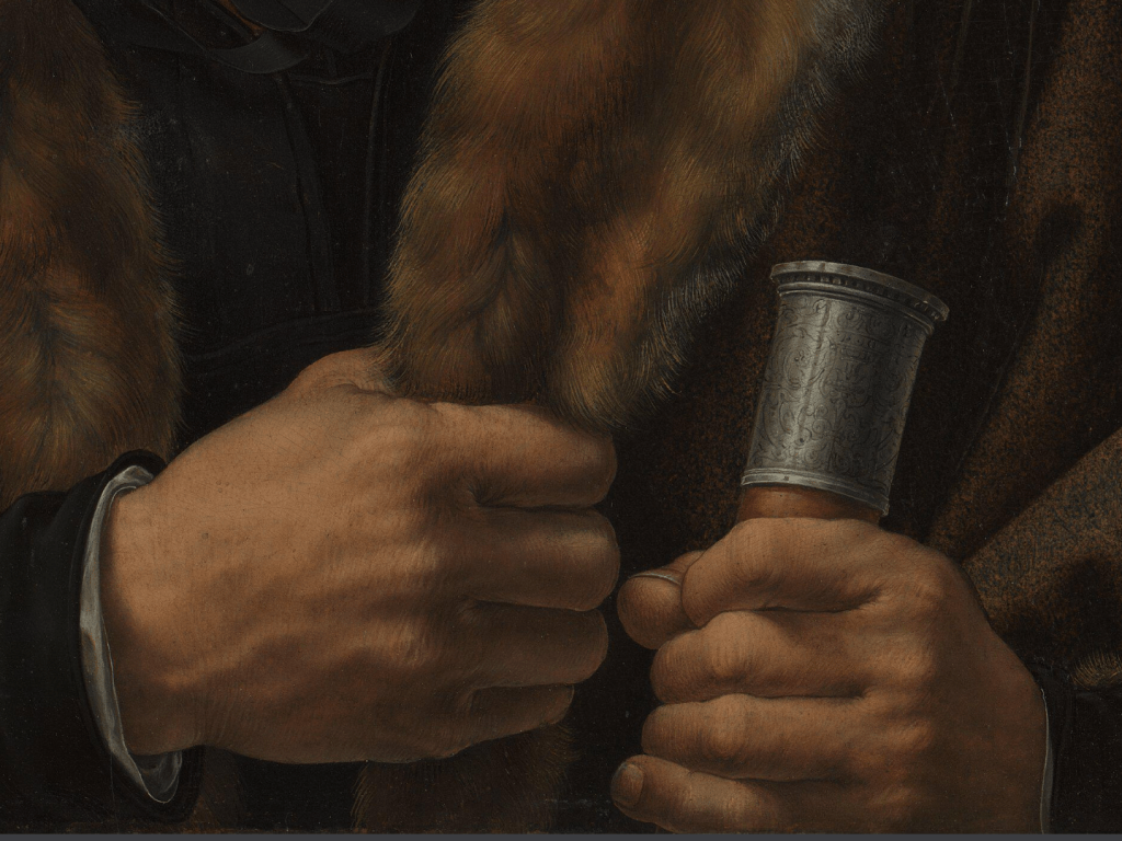 His achievements so far? It’s hard to say, but a certain wealth. The thick fur collar, which he grasps as if to bring it to our attention, must have cost a fair penny. The subtly decorated walking stick, with its carefully depicted, finely-etched silver top, presumably didn’t come cheap either. But there is no excessive adornment: no rings on the fingers, for example, which are clean, with neatly cut nails, and which are beautifully articulated. Each one is different – look at the phenomenal care with which Gossaert has traced the fall of light and shade on every joint, defining every knuckle and arthritic swelling.