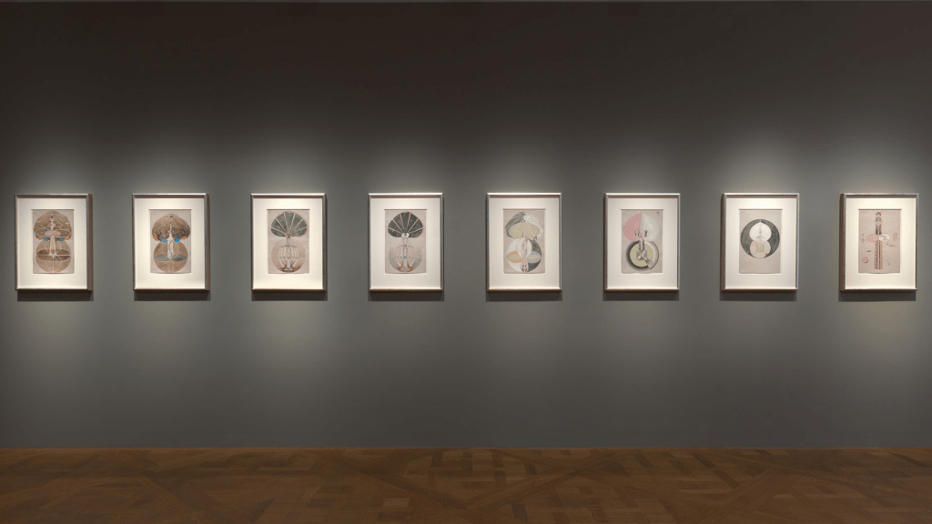 To give it its full title, this is Tree of Knowledge, The W Series. This is the full series – eight works in watercolour on paper, as exhibited by David Zwirner before it travelled to its new home, Glenstone, in Maryland, USA. As such, it is one of the very few works by the Swedish master not held by the Hilma af Klint Foundation (and the reason why this should be the case will be one of the things we will discover on Monday). What we see in the photo above are Nos. 1, 2, 3, 4, 5, 6, 7a and 7b. She often created series of paintings, rather than individual works, and, having amassed a huge number of them during her nearly eighty years, af Klint catalogued them, giving each series or group a letter or number: Tree of Knowledge, The W Series is actually one of the simpler titles. Today, though, I just want to focus on No. 1.