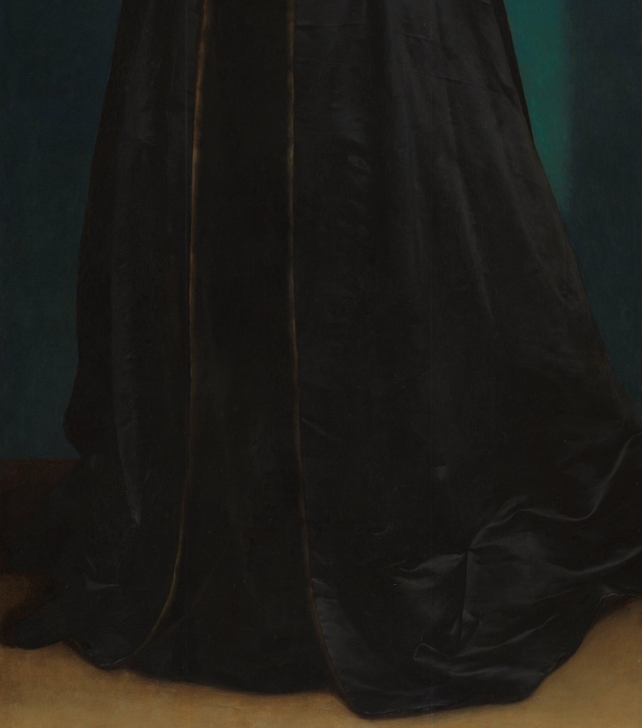 The solemnity is undoubtedly the result of being in mourning. It’s hard to see the dress itself in this detail: it is such a pure black that it is almost imperceptible. The dark space where it must be is framed by the fur lining of the coat, which can be seen all the way to the ground, even if it is far less evident than on the luxuriant collar. The coat itself is gloriously painted, with the black satin glinting and glowing in the sunlight, and spreading across the floor in waves. Towards the top of the detail there are some horizontal marks, running in parallel, which I take to be the remains of some folds. Another assumption of mine is that this coat was stored folded up, rather than hanging somewhere, but I could easily be wrong – the lines might be part of the structure of the satin itself (I’m not an expert in fabrics, let alone historical wardrobe practice…).