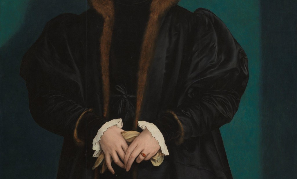 Her hat, dress and coat are all black. Just visible, but prominent because of its pristine whiteness, is the scalloped hem of the collar of a chemise, peeping out above the high neckline of her dress. The other ‘non-black’ element is the brown fur lining of her coat, rich, and soft, and opulent. It speaks of great wealth, and great warmth. Given that the sun is shining so brightly, I have always imagined that it must be the winter, or maybe early spring: a sunny, but brisk day. Before now though, for some reason, I have never stopped to pin down the date, but it turns out that I was right: it is what we would now class as towards the end of winter. Holbein made the drawings for this painting on the afternoon of 12 March, 1538.