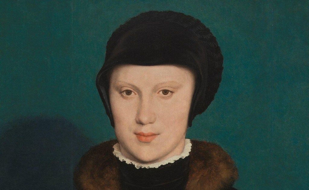 I have to be honest: she doesn’t look that upset. OK, so it’s 16 months later, but, while she is dutifully dressed in mourning, there is that barely suppressed smile. It’s almost like that situation when you want to laugh but mustn’t – there’s a real sense of control, gritted teeth. She was young, single, and fairly well off – enough to be happy, and, of course, entirely eligible. And – of course – there was someone in Europe looking for an eligible young woman at the time. He often was. He got through five in the end (the sixth, famously, surviving). Jane Seymour, the third wife of Henry VIII, had died in October 1537, and in March 1538 Hans Holbein was packed off to Brussels to paint Christina of Denmark, the widowed Duchess of Milan. He only got three hours with her – between one o’clock and four o’clock in the afternoon – before heading back to England. He would have made sketches, and, in all probability, a coloured chalk drawing with annotations, which sadly no longer survives. Many others like it do, though, and one is in the Holburne’s exhibition (I will show it to you on Monday). Holbein completed some sort of finished image, if not this full-length painting, fairly quickly, and Henry VIII was enormously pleased, ‘in better humour than he ever was, making musicians play on their instruments all day long’ (Shakespeare again: ‘If music be the food of love…’). He proposed marriage: which eligible young woman could refuse? However, Christina is supposed to have replied, ‘If I had two heads I would happily put one at the disposal of the King of England’. I so wish she had said that, but I’m afraid I can’t believe it. Let’s face it, Henry had only had one of his wives beheaded at this point (the first wedding had been annulled, and the third bride died) – so it was hardly a reputation. Still, she didn’t marry him. In 1541 she married Francis, Duke of Bar instead. He succeeded his father as Duke of Lorraine three years later (so Christina became the Duchess of Lorraine), and then died the following year. Christina basically went on to live happily ever after, reaching the ripe old age of 69, having been widowed twice with a total of less than six years married.