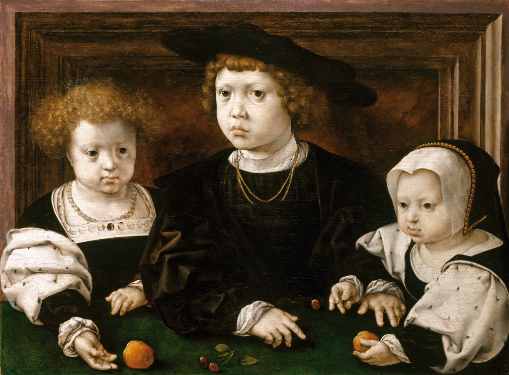 Painted Love – the Holburne’s exhibition – revolves around the portraits of eligible youths and maidens, of potential matches like Christina, of happy brides and grooms, and of the desired result: heirs, and even spares. And even if Holbein’s Christina of Denmark hasn’t made it to Bath, Christina herself has. One of the paintings, lent by His Majesty King Charles III, was painted by Jan Gossaert (artist of The Adoration of the Kings which I discussed detail by detail during Advent a few years back). Dating to 1526, it is entitled The Three Children of Christian III of Denmark, and the four-year-old Christina is on the right. You can never tell how someone will turn out.