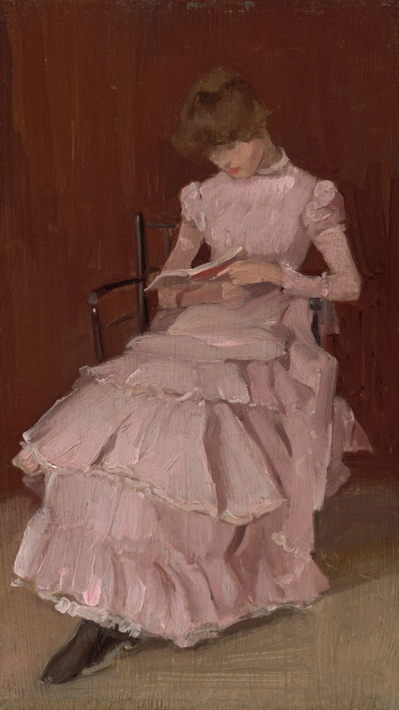 Arrangement in Black and Grey No. 2 was the first painting by Whistler to enter a British public collection – and notably, a Scottish one. In 1903 – the year of his death – he was to receive an honorary degree from the University of Glasgow. This may be the reason why, in 1936, his sister-in-law and heir, Rosalind Birnie Philip, bequeathed his estate to the University. Well, that and the fact that Whistler himself insisted that nothing be left to an English collection. This explains the University’s remarkable holdings of his – and of Beatrix’s – work. One of his paintings, for which Beatrix modelled, is entitled Harmony in Red: Lamplight (c. 1884-86). It is currently on show in the Hunterian Art Gallery, and you can see it below, on the left. Like Whistler’s Mother, there is no implication in the title that Whistler’s Wife is a portrait – although, having said that, they wouldn’t marry until 1888, two years after it was completed. On the right is a painting by Beatrix herself from the National Gallery of Art in Washington D.C. I chose this one because I am intrigued that the colour of the wall is so close to the palette of Whistler’s painting. It is entitled Peach Blossom, giving us no clue as to its meaning or content, nor even why it has that title – presumably the reference is to the colour of the dress. As we will see on Monday, they were clearly meant for each other.