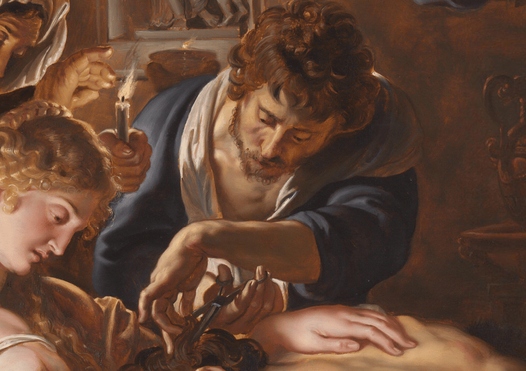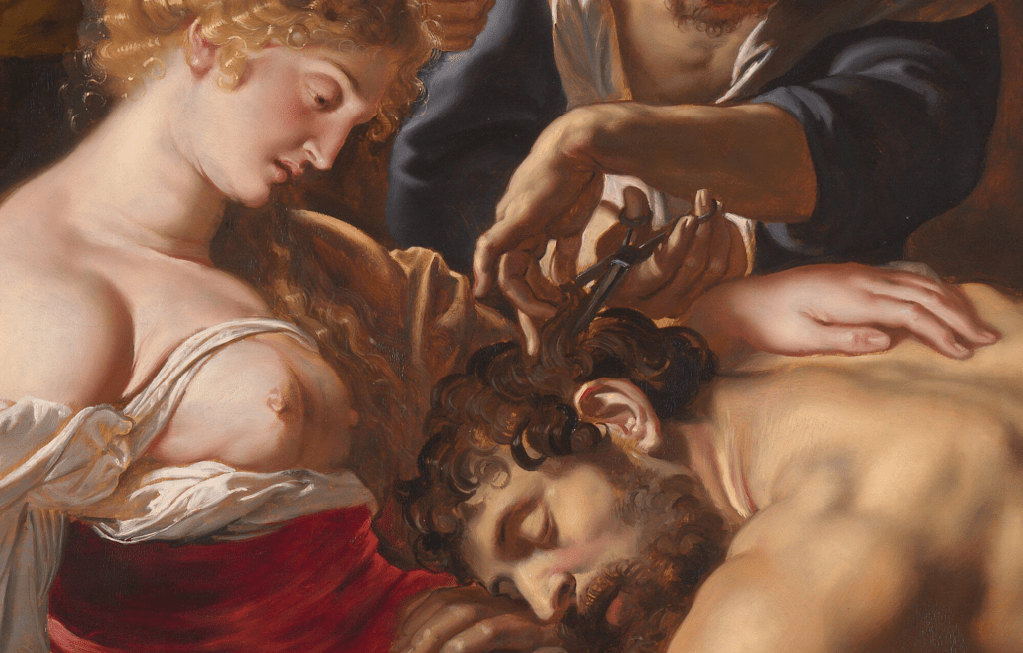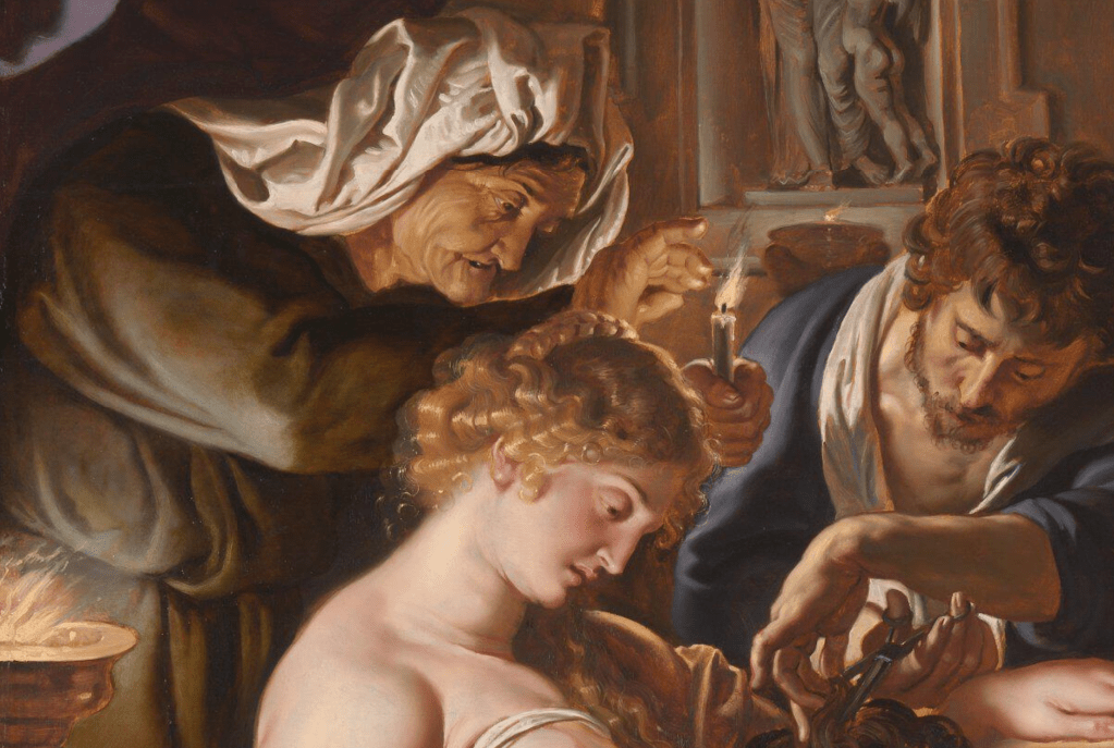 The light in this painting is playing so many roles. It highlights the details which Rubens has included in the background to tell us what the story is about, and it gives us a sense of character as well. It is the brazier on the far left which illuminates the young woman so brightly, after all. It also enhances her appearance: she is blonde and pale skinned, features which were celebrated as signs of beauty and of refinement throughout western European history. The man is darker skinned, and muscular: it is the fall of the light and the resulting shadows which tell us precisely how muscular he is. He appears to be fast asleep. The head resting on his right hand suggests as much, even if the hanging left arm might imply death (but if Rubens had wanted to show him dead, he would probably have painted him paler). And then there is the fact that his hair is being cut so cautiously: if you don’t want him to wake, you would need to be careful. Why worry how you do it if the man is dead? And while we’re at it, why is she topless? Why is he nearly naked? I’m sure you don’t need to ask: something has been going on… Or has it?