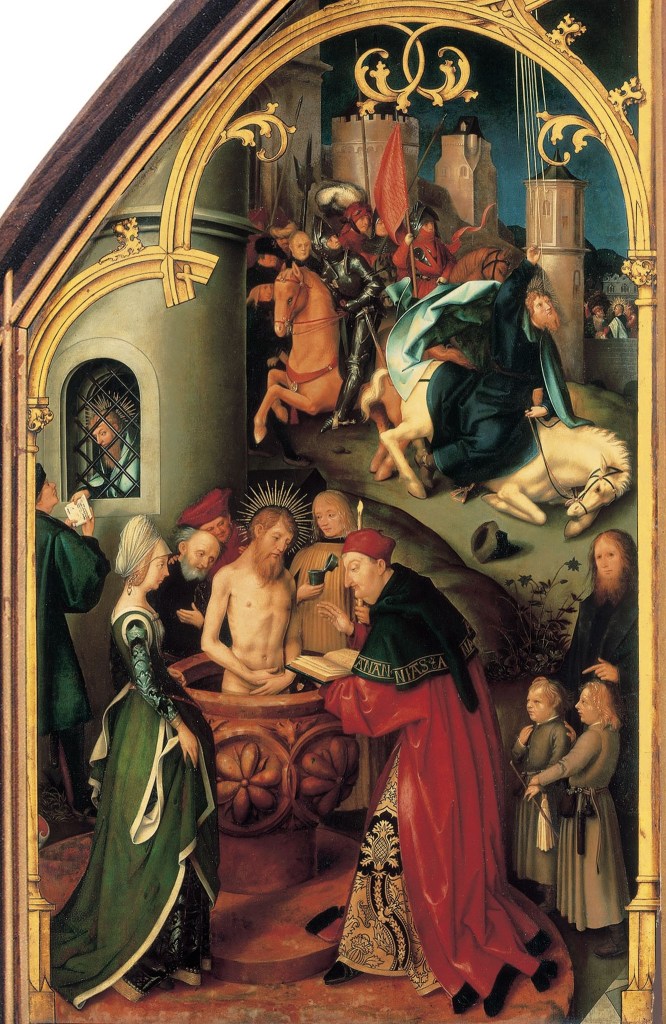 Holbein the Elder does not attempt to show the body turning to join the head… but that is hardly needed. To right we can see Paul’s final appearance on the altarpiece, being lowered from a window in a basket, and we are back with biblical authority: Acts 9:23-25. Paul – still known here by the name he grew up with, Saul – has been very successful and the local Jews are not happy that so many people have been converted: