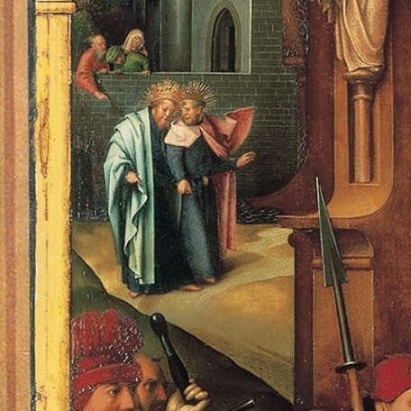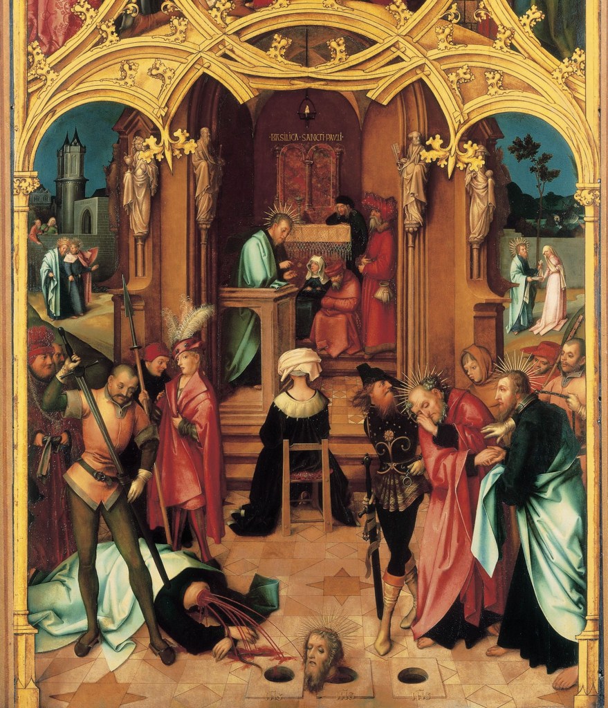 The beheading is shown in the foreground. Paul arrives from the right, an iron collar around his neck attached to a chain. He appears to console St Peter, dressed in a red cloak (German artists did not use the colours for saints with which many of us are familiar from Italian art). On the left the executioner sheaths his sword, while the corpse lies below, blood gushing from its neck. The serene looking head sits in the centre of the floor. Two other images of Paul appear at the back left and right: they are also related to the beheading. None of this is in the bible by the way – Paul was very much alive at the end of the Acts of the Apostles. It is all reported in apocryphal sources though. These details are derived from the Golden Legend (to which I have often referred), a collection of stories, some of which were already nearly a millennium old when they were gathered together by Jacopo da Voragine towards the end of the 13th century. As he was being led to his execution, we are told, Paul met a noble woman, a Christian, named Plautilla, and said to her,