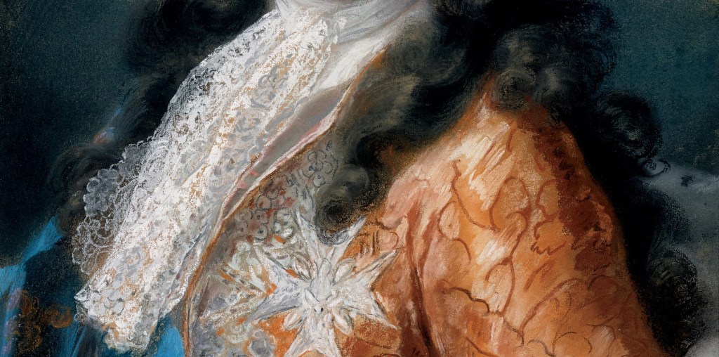 Her control of the technique was second to none, and you can see that here in the subtle variation of tones across the King’s face, which models the form in three dimensions while not making it too solid and sculptural. It is possible to blend different coloured pastels together, either with the fingers or rolls of paper (a process known as ‘stumping’), but you cannot mix them freely on the surface as you can with oils. This means that, if you want a greater degree of subtlety, you need a large number of different crayons covering the whole range of hues and tones (colours and shades). As well as her subtlety of tone, Carriera was also remarkably adept at suggesting that you can see things which aren’t actually there – the hair for example. The locks on the right of the image were built up on a very deep brown, which is just shading – there is nothing especially ‘hair-like’ about it: it’s almost plain, unmodulated black. But then the swift strokes of auburn on top of it, tipped with touches of butterscotch, give it all the lustre of youth and build it up into vibrant curls. All of this encourages the mind’s eye to fill in details for the almost black shadows which, in reality, have no detail. The King’s eyes are given catchlights with the smallest dab of a white crayon, and the mind expands these to fill the whole surface of the eye, white and all, with a liquid glow. The catchlights also help to focus the eyes on us – or maybe, looking just past us.