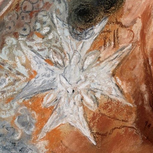 The lace of the stock is also a marvel of abbreviation. Using a white crayon again, she would have run the length of it across the surface, creating a white haze, almost like a semi-transparent gauze. Then, using a sharpened end, she would have drawn in a few loops of white around the edges to create the sensation of lace. For the water silk of the sleeve the orange/red base was elaborated with darker red lines, and some of the spaces then filled with freely drawn white lines of different strengths to suggest different intensities of reflected light. Where there is less reflection, the base shows through more.