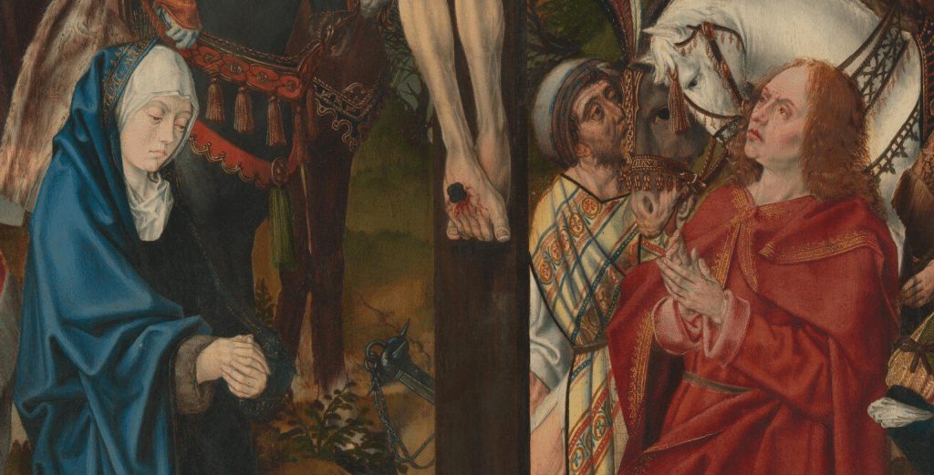 This is not the prettiest painting. Indeed, it is one of the more grotesque works that I’ve written about, but art is not only about beauty, it is also about truth: the grotesque elements of this image say a lot about the cruelty of the acts performed over Easter, and speak to the suffering of Jesus. This is not Charles Wesley’s ‘Gentle Jesus, Meek and Mild’, even if he does appear remarkably at peace, despite everything. The cross on which he is crucified is planted in the centre of the painting, his figure placed frontally towards us. His mother, the Virgin Mary, and apostle, St John the Evangelist, stand at the foot of the cross in what, by the time this was painted, had long been their traditional places. Mary is on our left and John, our right, under Jesus’s right and left hands respectively. There is more space around these three main figures than anywhere else, and their pure bold colours – blue for Mary, red for John, and pale, naked flesh for Jesus – make them stand out from the crowd. They are isolated in the midst of what is otherwise a riot of forms in movement, of rich, patterned colours, and bold emotions. There is almost too much to look at.