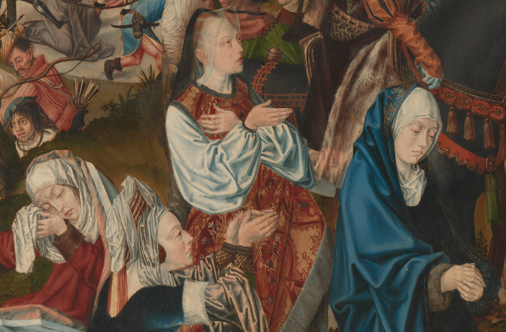 It is better to be at the right hand of God, particularly as regards the Last Judgement (the damned will be on his left), and although the Virgin and Evangelist are both assured of their salvation (well, Mary has no sin, so does not need to be ‘saved’), her placement on Christ’s right tells us that her status is higher than that of John, however close to Christ he might be. Both their verticality, parallel to the cross, and their location directly under right and left hands, tie them to the figure of Christ. Otherwise, the ‘good’ and the ‘bad’ are in their respective places. Mary, at Christ’s right, is flanked by three holy women, all of whom were also called Mary. In the left foreground the diagonal formed by the kneeling woman continues through the fur hem of her standing companion, this diagonal leading our attention towards Jesus on the cross. John, at Jesus’s left, is surrounded by reprobates: soldiers, and others bent on Christ’s destruction. Although this side is more disordered, there is also a more subtle diagonal, formed by the hilt of the sword, and the back of the crouching man who wears it right in the bottom corner (this will be clearer in a detail below). The standing soldier, whose right arm holds onto an angled spear in an exaggerated gesture typical of the Master of the Aachen Altarpiece, also acts as a repoussoir: with his back to us he is looking into the painting, which encourages us to do the same.