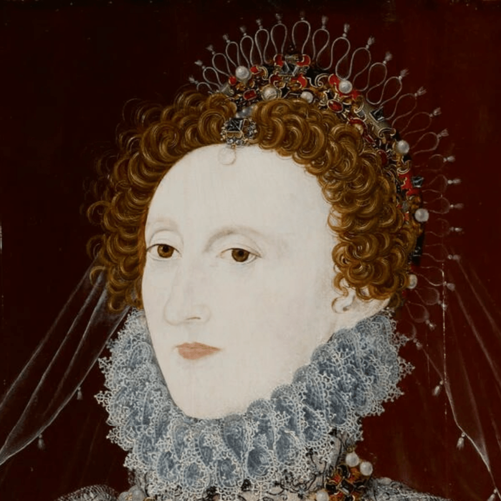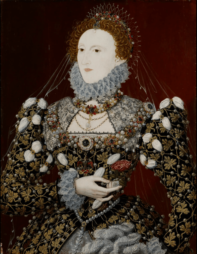 Her red hair is tightly curled around her high forehead (the latter a sign of beauty in the 15th and 16th centuries), mimicking the looping edges of the impossibly delicate (and delicately painted) headdress, from which a diaphanous veil hangs, spreading down behind her neck and over her shoulders. The headdress echoes the form of a crown – she is Queen, after all – but also of a halo: here and elsewhere the artist is subtly playing on the imagery of the Catholic Church. Although Elizabeth was Protestant, she was keen on some aspects of Catholic worship: singing, for example – and in this she could be seen as responsible for the great English tradition of church music. Her face is pale, without a mark, you could even say ‘immaculate’ (which might tell you where we are going…), this pallor and perfection speaking of her famed virginity – which, whether historical fact or convenient fiction, remained her official status.