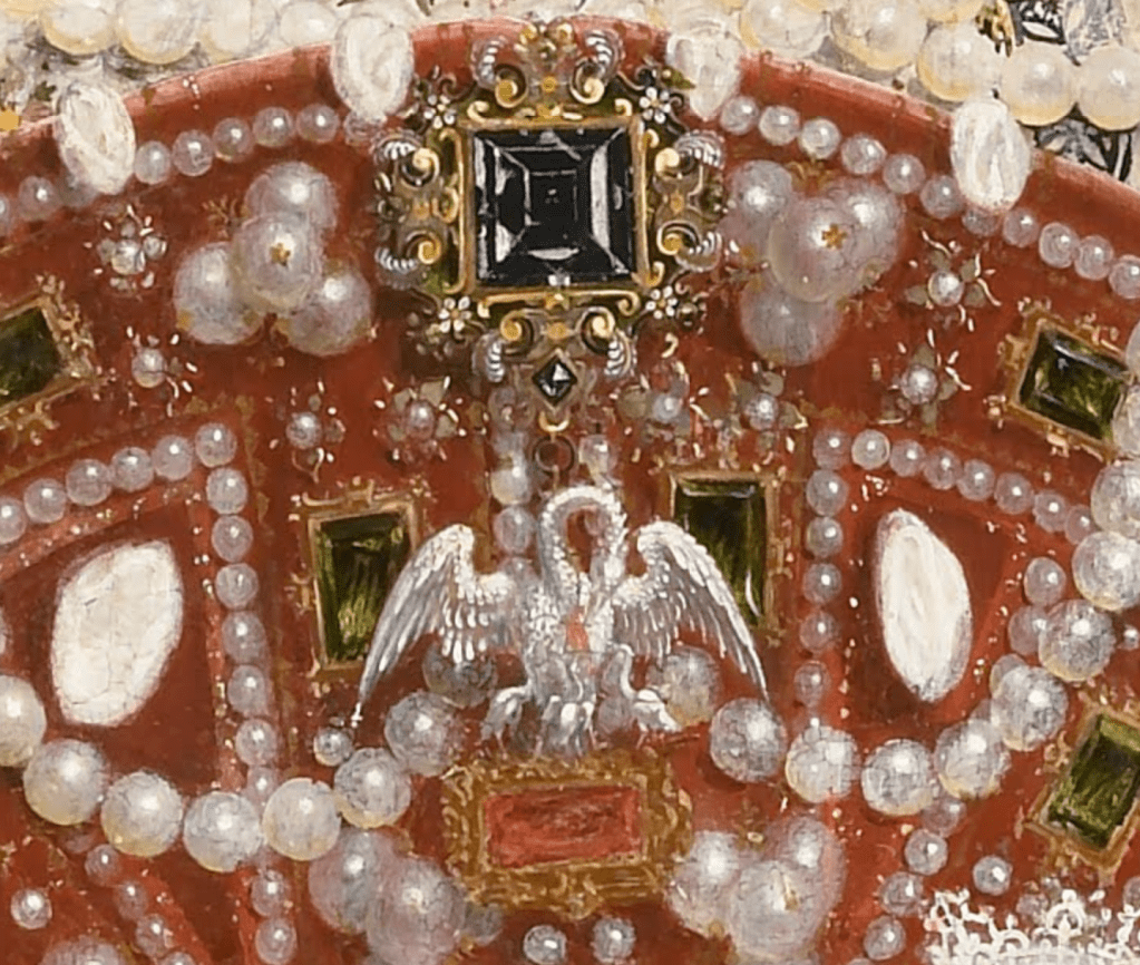 There are also other associations at play here. There were other virgin queens, after all. Or rather, one other: Mary, the Virgin Queen of Heaven. One of the many epithets applied to Mary was Rosa Senza Spina – ‘a rose without thorns’ – the beauty without the results of sin: immaculate. As well as its link to the Tudors, the rose which Elizabeth holds can also remind us of Mary. After all, we have already noted that Elizabeth has the hint of a halo: in some respects her image would have replaced that of the Virgin Mary in the popular imagination, she becomes the mother of us all. The Phoenix brooch was not Elizabeth’s only jewel, of course – with over 2000 gowns, there must have been many more.