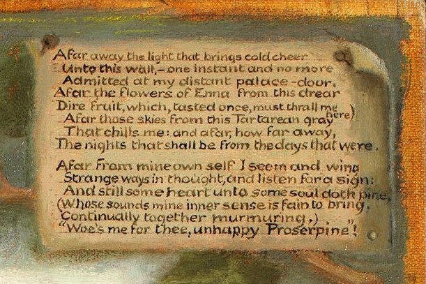 This detail comes from a photograph of the painting taken out of its frame – we can see the edges of the canvas which have not been painted. This close we can also see that the piece of paper at the top right, although painted, appears to be attached, trompe-l’oeil fashion, with pins at the corners, although these don’t stop it from curling back at the top right. It is tightly inscribed with the fourteen lines of a sonnet. The paper is affixed over the ivy, which spreads behind the head of Proserpine, the woody stem a subdued version of her flaming red hair, the leaves echoing her green eyes. The sonnet is Rossetti’s own, and entirely legible – here is a detail, and a transcription.