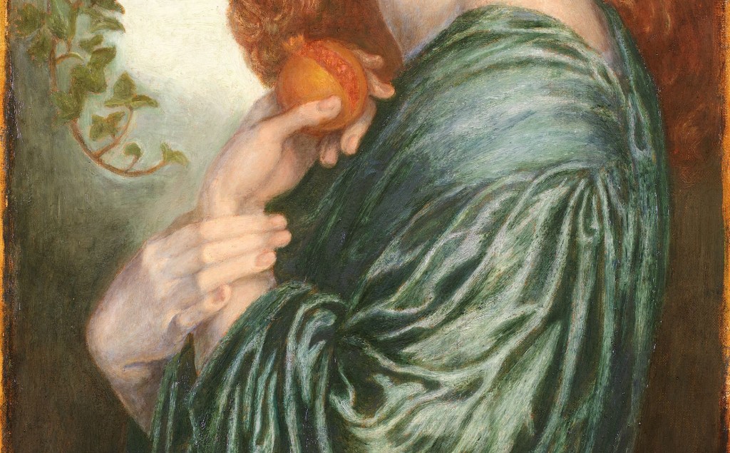 Her right hand holds her left wrist, the elongated, but elegant fingers holding lightly, and suggesting a sense of regret – if only she could have pulled the other hand away, and not eaten. The fingers of the left hand, equally elongated, equally elegant, also touch the pomegranate delicately: a melancholy memory it would be better to forget, but which cannot be let go.