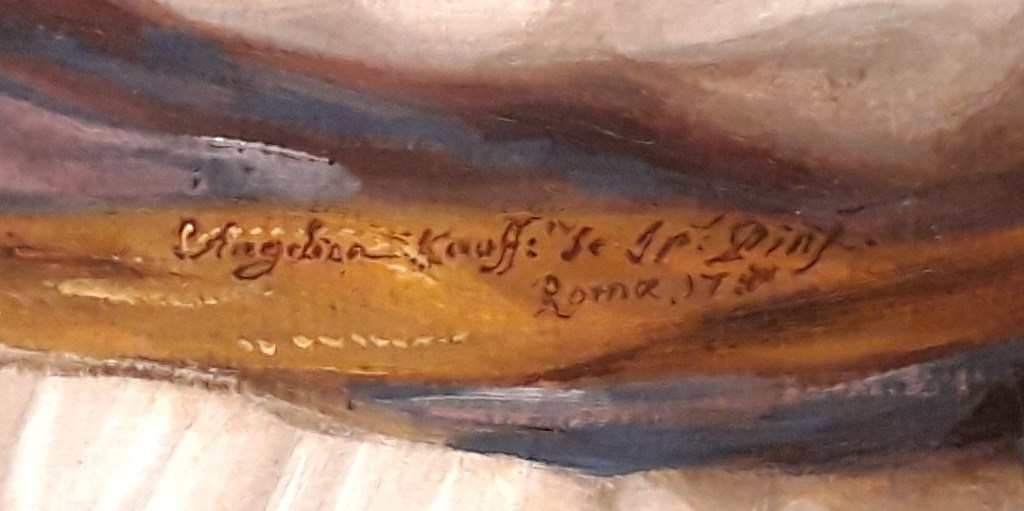 [When the exhibition was cancelled – rather than postponed – a few months later, it seemed likely that it would never see the light of day. However, four years after I posted this, the RA is finally paying an appropriate tribute to one of its founder members. Trust me, it was worth the wait: I do hope you can join me on Monday. As a post script, here is Kauffman’s signature, painted on her own belt.]