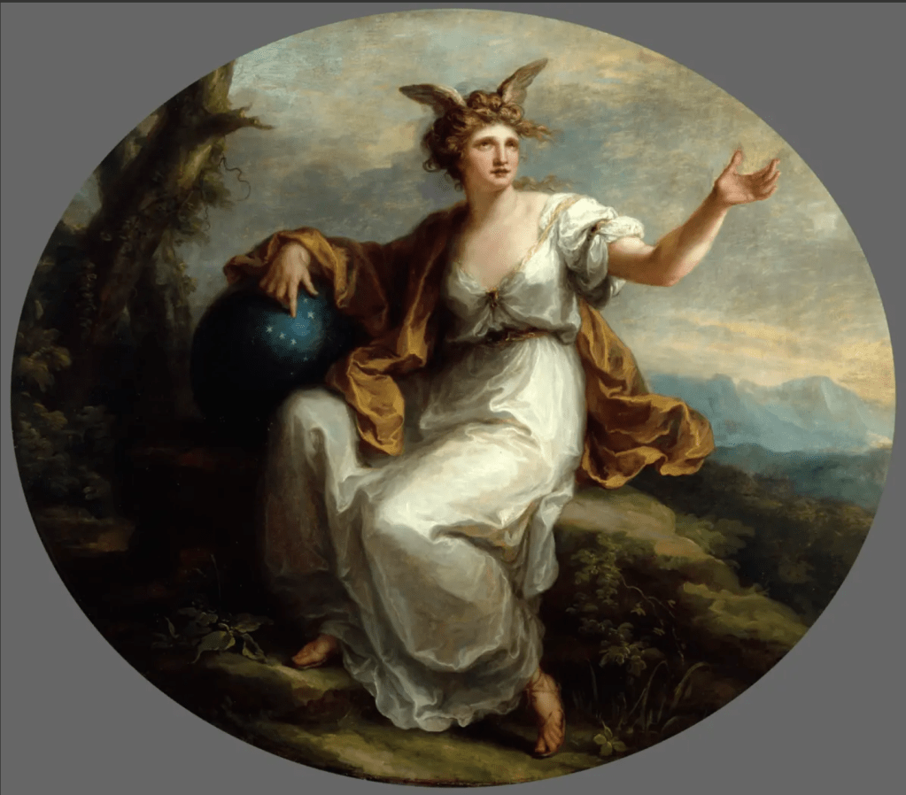 Invention wears a white dress and a butterscotch-coloured cloak, the former matching the lighter colours of her pale complexion, while the latter blends with her golden hair. She sits in a landscape on a rock, which has undefined vegetation growing around it. Her right knee is raised with the shin vertical, and the ball of the foot planted firmly on the ground, while her left knee is lower, the foot trailing off to our right. A dark blue globe lies on the upper surface of the sloping rock and rests against Invention’s knee. Her right hand, draped with the butterscotch cloak, rests on the globe. Her left arm is raised, the hand upturned, as if towards the heavens. She gazes upwards, past what, at first glance, might appear to be a peculiar form of headdress. On the far right there are distant, blue mountains, with a river, or lake curling around their base – not unlike the mountains of Switzerland, where Kauffman was born. On the other side of the painting, in there middle ground, there are two tree trunks. They cross each other (they grow on opposing, steep diagonals) and close off the composition to the left.