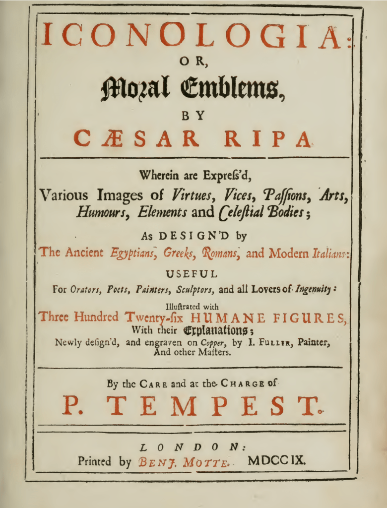 Whatever the meaning of the various elements portrayed, the painting is, surely, incredibly inventive in itself. But what could it all mean? It really helps if we turn to a book published originally in 1593, the Iconologia by Cesare Ripa, in which various ‘abstract’ qualities, whether virtues or vices, arts or sciences, moods and even cities were described as visual, allegorical figures. The work became truly successful – and useful for artists – ten years after its original publication when a new edition was brought out which included woodcuts, thus giving visual form to some of the many concepts described. Many other editions followed, including an English translation, published in 1719. I have chosen this version as a result of its availability: it was digitised in 2009 by the Warburg Institute, and is available online. Below is the title page – I hope you can read it, but don’t worry if it’s not clear – followed by the description of Invention, which I have transcribed for the sake of clarity.