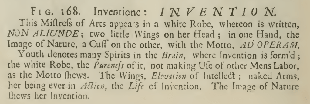 Youth denotes many Spirits in the Brain, where Invention is form’d; the white Robe, the Pureness of it, not making Use of other Mens Labor, as the Motto shews. The Wings, Elevation of Intellect; naked Arms, her being ever in Action, the Life of Invention. The Image of Nature shews her Invention.