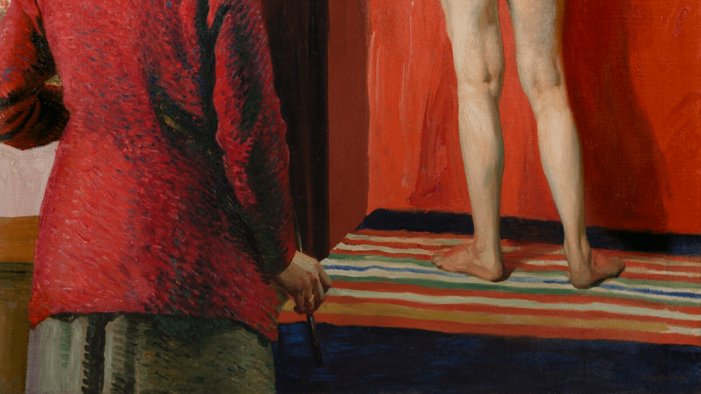 It’s a remarkably original choice for any artist – a self portrait seen from behind: she is focussing on what she does, not what she looks like. Knight appears sensibly dressed, with a mid-length red jacket over a grey skirt, and what I would interpret as a striped foulard around her neck (although, as you probably realise, I am not an expert on women’s dress). As it happens, it’s not a jacket, per se, but a favourite cardigan, which she called ‘The Cornish Scarlet’. She bought it at a jumble sale in Penzance for half a crown (or 2/6, or 12.5p, depending on your age), and it can be seen in a number of her paintings. Nowadays it would be classed as ‘vintage’ and cost a whole lot more. She also wears a black hat with a colourful ribbon almost hidden by the upturned brim: all respectable women should wear a hat when in public. Her hair appears to have been plaited and pinned up. If she hadn’t turned her head to the right, we wouldn’t be able to tell who she was – and it is not clear why she has turned so far: certainly not to look at the model, as she looks past her, to something out of the frame. She is holding a paint brush in her right hand, and, from the bend of her left elbow, we can imagine that she is holding a palette in her left. The model, who is completely naked, stands with her back to us, on a striped rug which is itself on a raised platform. While her heels are more or less parallel to the picture plane, she is turned to the left, allowing us a partial view of one breast. She raises her arms around her head, with her right and left hands resting on her hair and right arm respectively. Behind her is a red screen. It may be a folding screen, although the right-angled section to the left has a trim not seen in the plain vermillion area behind her, which could even be a brighter cloth hanging over the screen: the construction is not entirely clear. In front of it, though, to the left, and behind the image of the artist, is the canvas that Knight is currently working on. Having seen the model herself, here we see her painted image, and, to the left of her, the part of the red screen that the artist has completed so far.