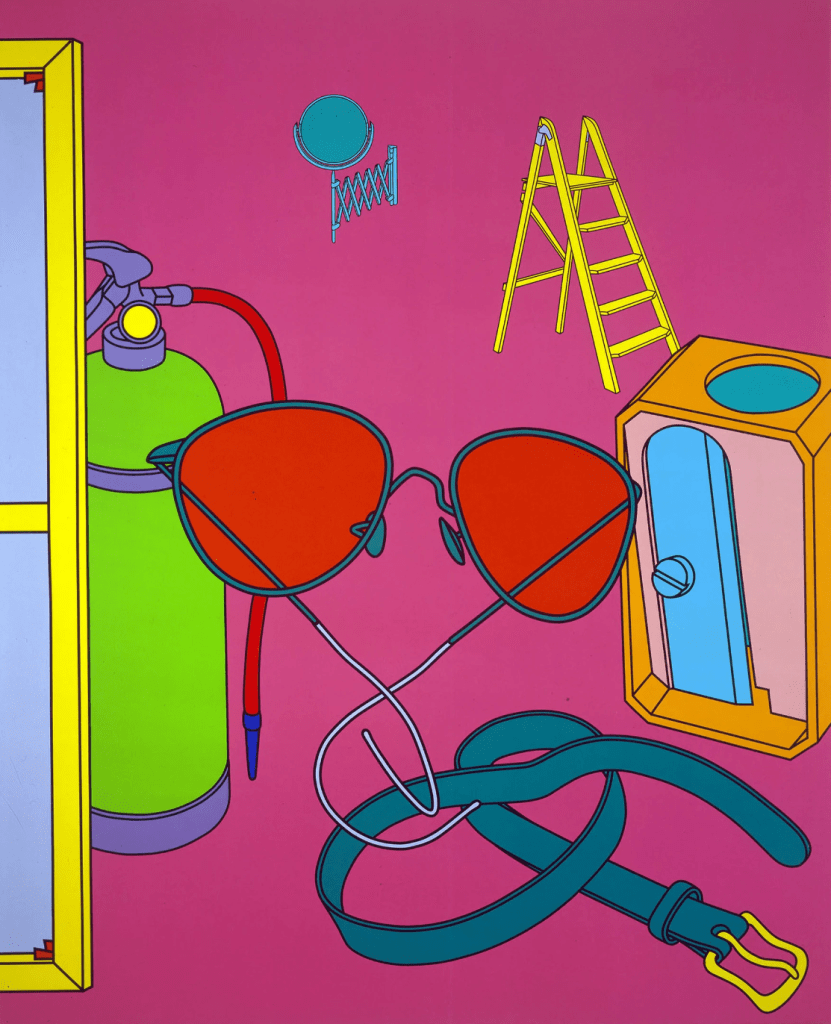 It would be easy to make the mistake that Michael Craig-Martin’s early work was highly cerebral – but that would be to deny its essential materiality, its solidity, and the implied drama inherent in its construction: so many things are only precariously secure. And in the same way, you could – and several critics do – deny that the later, highly coloured works are anything more than superficially decorative, given their saturated, attention-grabbing colour and commanding scale. But of course there is, as there always is, more to them than meets the eye. What we see in this painting is a collection of objects which may or may not be connected. Or rather, they are connected, if only because they all appear in the same painting – but is there anything else that unites them? Reading from left to right and top to bottom, we can see the back of a canvas, a mirror, a ladder, a fire extinguisher, a pair of sunglasses, a pencil sharpener and a belt. I have no doubt that these are the objects depicted in this painting, although art is subjective, and you might be seeing something else.